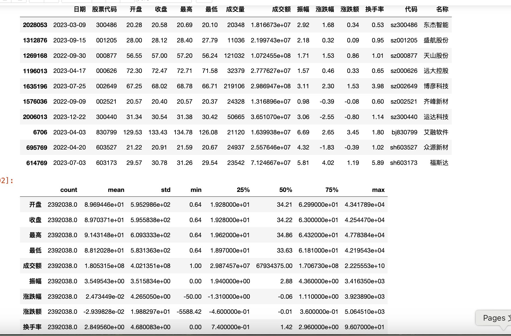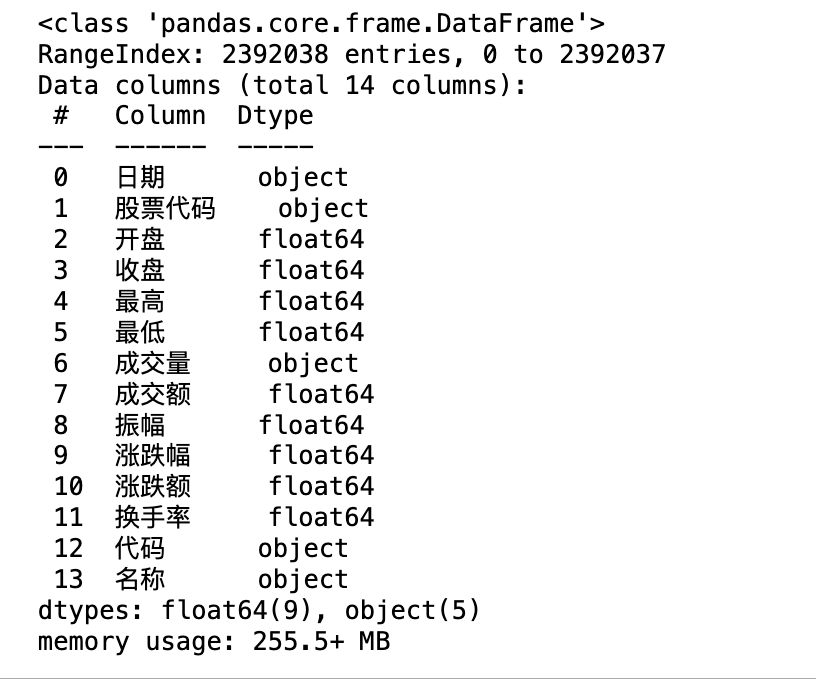 <class 'pandas.core.frame.DataFrame'>RangeIndex: 2392038 entries, 0 to 2392037Data columns (total 14 columns): # Column Dtype --- ------ ----- 0 日期 object 1 股票代码 object 2 开盘 float64 3 收盘 float64 4 最高 float64 5 最低 float64 6 成交量 object 7 成交额 float64 8 振幅 float64 9 涨跌幅 float64 10 涨跌额 float64 11 换手率 float64 12 代码 object 13 名称 object dtypes: float64(9), object(5)memory usage: 255.5+ MB