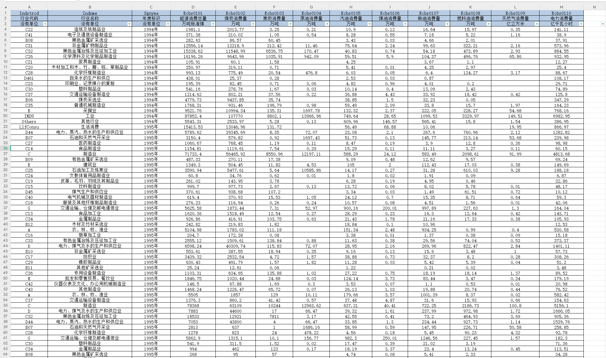 行业代码 行业名称 年度标识 能源消费总量 煤炭消费量 焦炭消费量 原油消费量 汽油消费量 煤油消费量 柴油消费量 燃料油消费量 天然气消费量 电力消费量