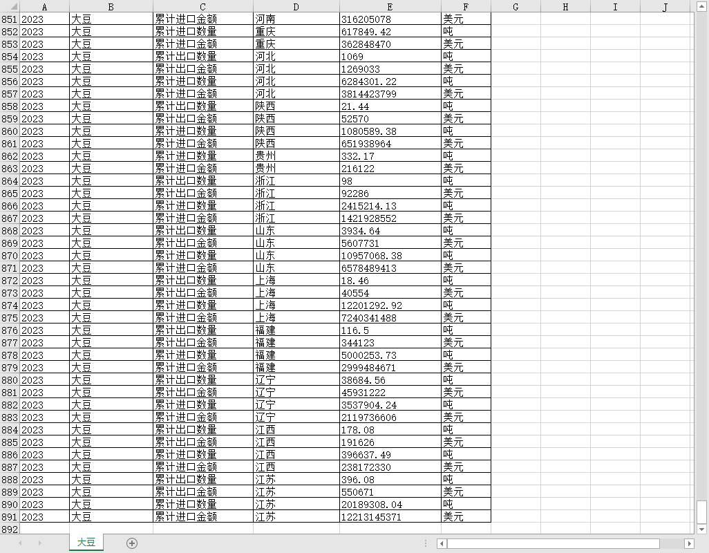 年份、种类、 面积、累计出口数量、累计出口金额、累计进口数量、累计进口金额、省份、单位。