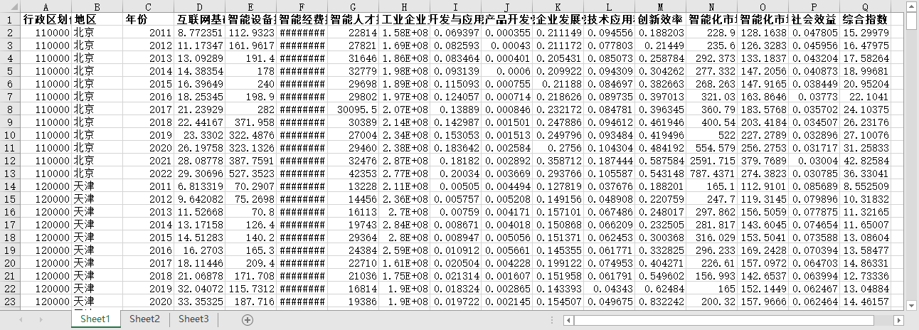 行政区划代码 地区 年份 互联网基础投入(光缆/省域面积) 智能设备投入(信传软件服务业固定资产投资额) 智能经费投入(高技术R&D经费内部支出(万元)) 智能人才投入(高技术制造业RD人员) 工业企业主营业务收入(万元) 软件开发与应用情况 智能产品开发情况 智能企业发展情况 智能技术应用程度 创新效率 智能化市场利润 智能化市场效率(每万元/人) 社会效益 综合指数