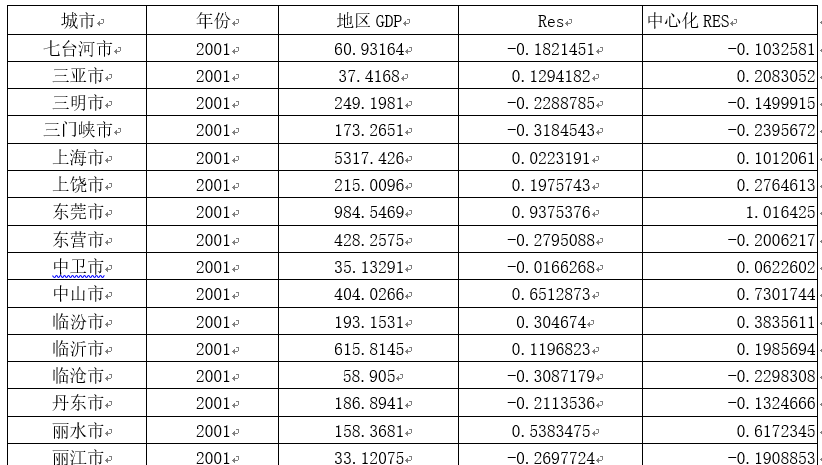 城市名称、年份、地区GDP、Res、中心化RES。