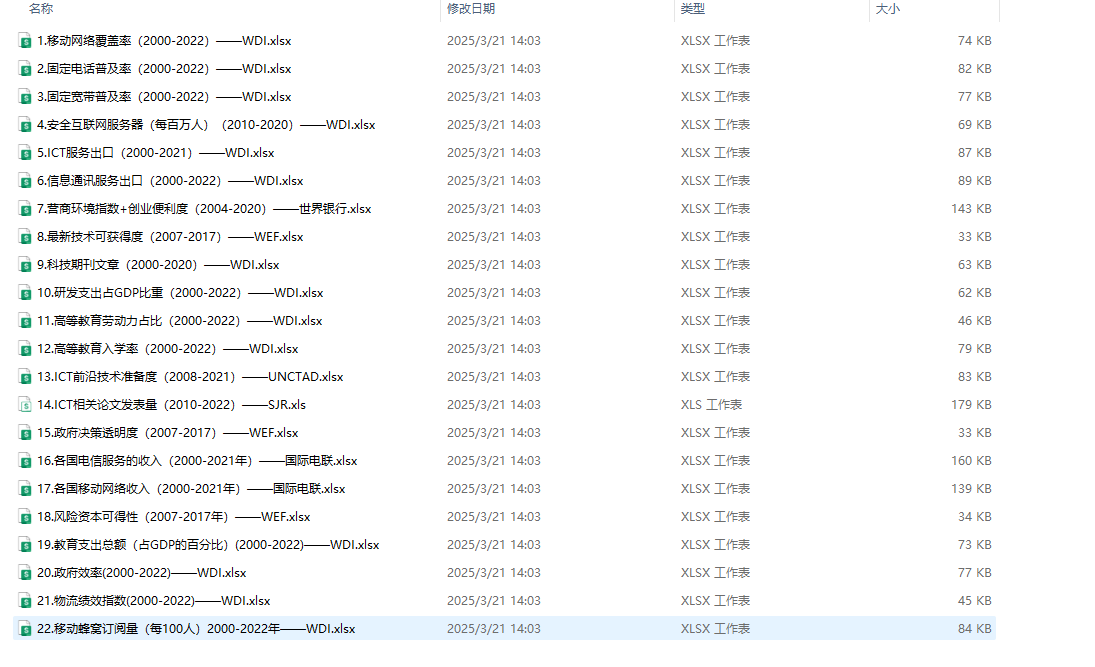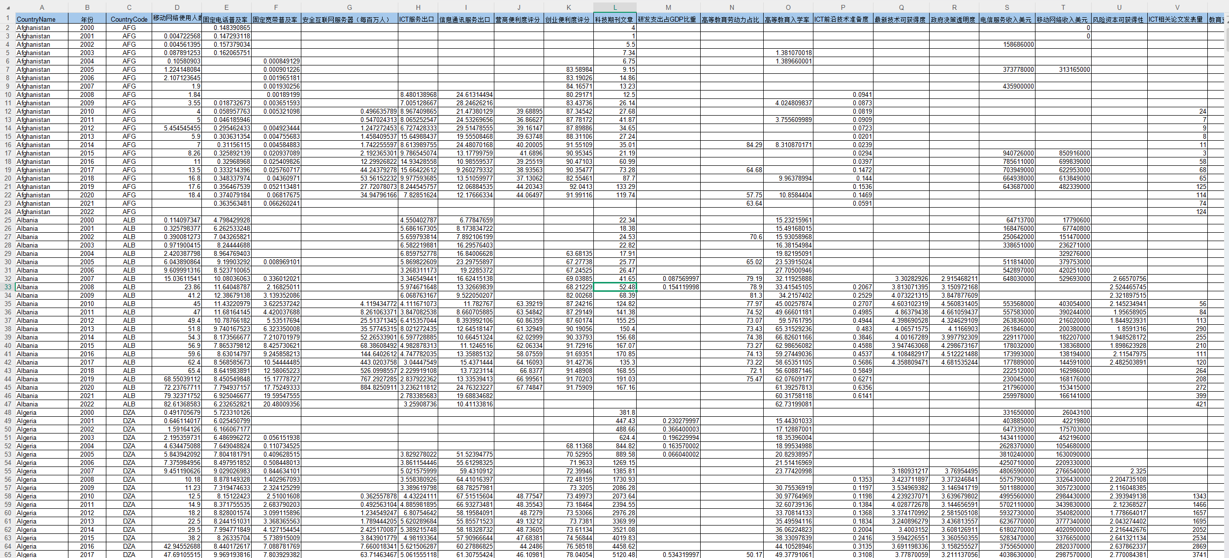 国家名称 年份 国家代码 移动网络使用人数 固定电话普及率 固定宽带普及率 安全互联网服务器(每百万人) ICT服务出口 信息通讯服务出口 营商便利度评分 创业便利度评分 科技期刊文章 研发支出占GDP比重 高等教育劳动力占比 高等教育入学率 ICT前沿技术准备度 最新技术可获得度 政府决策透明度 电信服务收入美元 移动网络收入美元 风险资本可获得性 ICT相关论文发表量 教育支出总额占比 政府效率 物流绩效指数 移动蜂窝订阅量(每100人)