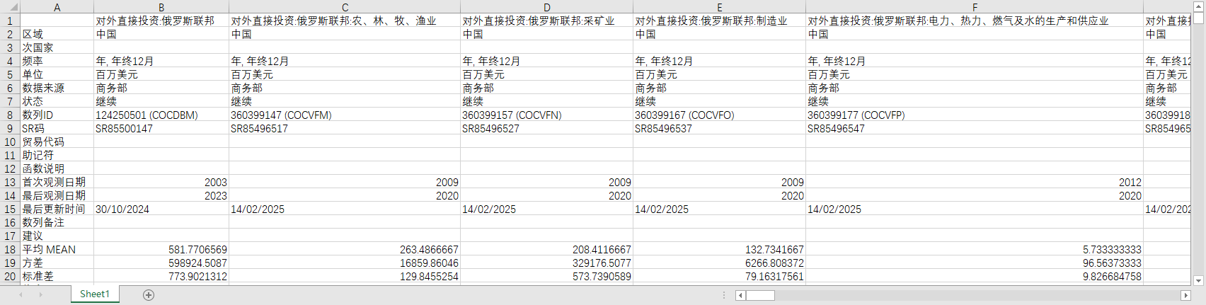对外直接投资:俄罗斯联邦 对外直接投资:俄罗斯联邦:农、林、牧、渔业 对外直接投资:俄罗斯联邦:采矿业 对外直接投资:俄罗斯联邦:制造业 对外直接投资:俄罗斯联邦:电力、热力、燃气及水的生产和供应业 对外直接投资:俄罗斯联邦:建筑业 对外直接投资:俄罗斯联邦:交通运输、仓储和邮政业 对外直接投资:俄罗斯联邦:信息传输、软件和信息技术服务业 对外直接投资:俄罗斯联邦:批发和零售业 对外直接投资:俄罗斯联邦:住宿和餐饮业 对外直接投资:俄罗斯联邦:金融业 对外直接投资:俄罗斯联邦:房地产业 对外直接投资:俄罗斯联邦:租赁和商务服务业 对外直接投资:俄罗斯联邦:科学研究和技术服务业 对外直接投资:俄罗斯联邦:水利、环境和公共设施管理业 对外直接投资:俄罗斯联邦:居民服务、修理和其他服务业 对外直接投资:俄罗斯联邦:教育 对外直接投资:俄罗斯联邦:卫生和社会工作 (DC)对外直接投资:俄罗斯联邦:卫生、社会保障和社会福利业 对外直接投资:俄罗斯联邦:文化、体育和娱乐业 对外直接投资:俄罗斯联邦:公共管理、社会保障和社会组织 (DC)对外直接投资:俄罗斯联邦:公共管理和社会组织 对外直接投资:俄罗斯联邦:其它行业 对外直接投资:俄罗斯联邦:截至累计 对外直接投资:俄罗斯联邦:截至累计:农、林、牧、渔业 对外直接投资:俄罗斯联邦:截至累计:采矿业 对外直接投资:俄罗斯联邦:截至累计:制造业 对外直接投资:俄罗斯联邦:截至累计:电力、热力、燃气及水的生产和供应业 对外直接投资:俄罗斯联邦:截至累计:建筑业 对外直接投资:俄罗斯联邦:截至累计:交通运输、仓储和邮政业 对外直接投资:俄罗斯联邦:截至累计:信息传输、软件和信息技术服务业 对外直接投资:俄罗斯联邦:截至累计:批发和零售业 对外直接投资:俄罗斯联邦:截至累计:住宿和餐饮业 对外直接投资:俄罗斯联邦:截至累计:金融业 对外直接投资:俄罗斯联邦:截至累计:房地产业 对外直接投资:俄罗斯联邦:截至累计:租赁和商务服务业 对外直接投资:俄罗斯联邦:截至累计:科学研究和技术服务业 对外直接投资:俄罗斯联邦:截至累计:水利、环境和公共设施管理业 对外直接投资:俄罗斯联邦:截至累计:居民服务、修理和其他服务业 对外直接投资:俄罗斯联邦:截至累计:教育 对外直接投资:俄罗斯联邦:截至累计:卫生和社会工作 (DC)对外直接投资:俄罗斯联邦:截至累计:卫生、社会保障和社会福利业 对外直接投资:俄罗斯联邦:截至累计:文化、体育和娱乐业 对外直接投资:俄罗斯联邦:截至累计:公共管理、社会保障和社会组织 (DC)对外直接投资:俄罗斯联邦:截至累计:公共管理和社会组织 对外直接投资:俄罗斯联邦:截至累计:其它行业
