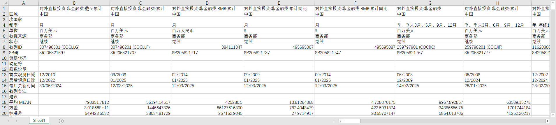 中国全国对外直接投资额非金融类2010-202501月度2002-2024年度数据