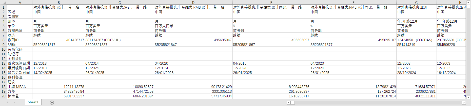 累计:一带一路 非金融类:累计:一带一路 非金融类:RMB:累计:一带一路 非金融类:累计同比:一带一路 非金融类:RMB:累计同比:一带一路 亚洲 亚洲:阿富汗 亚洲:巴林 亚洲:孟加拉国 亚洲:文莱 亚洲:塞浦路斯 亚洲:柬埔寨 亚洲:东帝汶 亚洲:中国香港特别行政区 亚洲:印度 亚洲:印度尼西亚 亚洲:伊朗 亚洲:伊拉克 亚洲:以色列 亚洲:日本 亚洲:约旦 亚洲:哈萨克斯坦 亚洲:吉尔吉斯斯坦 亚洲:朝鲜 亚洲:韩国 亚洲:科威特 亚洲:老挝 亚洲:黎巴嫩 亚洲:马尔代夫 亚洲:中国澳门特别行政区 亚洲:马来西亚 亚洲:蒙古 亚洲:缅甸 亚洲:尼泊尔 亚洲:阿曼 亚洲:巴基斯坦 亚洲:巴勒斯坦 亚洲:菲律宾 亚洲:卡塔尔 亚洲:沙特阿拉伯 亚洲:新加坡 亚洲:斯里兰卡 亚洲:叙利亚 亚洲:塔吉克 亚洲:中国台湾 亚洲:泰国 亚洲:土库曼 亚洲:土耳其 亚洲:阿拉伯联合酋长国 亚洲:乌兹别克 亚洲:越南 亚洲:也门共和国 非洲 非洲:阿尔及利亚 非洲:安哥拉 非洲:贝宁 非洲:博茨瓦纳 非洲:布基纳法索 非洲:布隆迪 非洲:喀麦隆 非洲:佛得角 非洲:中非 非洲:乍得 非洲:科摩罗 非洲:民主刚果 非洲:刚果 非洲:科特迪瓦共和国 非洲:吉布提 非洲:埃及 非洲:赤道几内亚 非洲:厄立特里亚 非洲:埃塞俄比亚 非洲:加蓬 非洲:冈比亚 非洲:加纳 非洲:几内亚 非洲:几内亚比绍 非洲:肯尼亚 非洲:莱索托 非洲:利比里亚 非洲:利比亚 非洲:马达加斯加 非洲:马拉维 非洲:马里 非洲:毛里塔尼亚 非洲:毛里求斯 非洲:摩洛哥 非洲:莫桑比克 非洲:纳米比亚 非洲:尼日尔 非洲:尼日利亚 非洲:卢旺达 非洲:圣多美和普林西比 非洲:塞内加尔 非洲:塞舌尔 非洲:塞拉利昂 非洲:南非 非洲:南苏丹 非洲:苏丹 非洲:坦桑尼亚 非洲:多哥 非洲:突尼斯 非洲:乌干达 非洲:赞比亚 非洲:津巴布韦 欧洲 欧洲:阿尔巴尼亚 欧洲:亚美尼亚 欧洲:奥地利 欧洲:阿塞拜疆 欧洲:白俄罗斯 欧洲:比利时 欧洲:波斯尼亚—黑塞哥维那 欧洲:保加利亚 欧洲:克罗地亚 欧洲:捷克 欧洲:丹麦 欧洲:爱沙尼亚 欧洲:芬兰 欧洲:法国 欧洲:格鲁吉亚 欧洲:德国 欧洲:希腊 欧洲:匈牙利 欧洲:冰岛 欧洲:爱尔兰 欧洲:意大利 欧洲:拉脱维亚 欧洲:列支敦士登 欧洲:立陶宛 欧洲:卢森堡 欧洲:马其顿 欧洲:马耳他 欧洲:荷兰 欧洲:挪威 欧洲:波兰 欧洲:葡萄牙 欧洲:罗马尼亚 欧洲:俄罗斯 欧洲:塞尔维亚 欧洲:黑山 欧洲:斯洛伐克 欧洲:斯洛文尼亚 欧洲:西班牙 欧洲:瑞典 欧洲:瑞士 欧洲:乌克兰 欧洲:英国 拉丁美洲 拉丁美洲:安提瓜和巴布达 拉丁美洲:阿根廷 拉丁美洲:巴哈马 拉丁美洲:巴巴多斯 拉丁美洲:伯利兹 拉丁美洲:玻利维亚 拉丁美洲:英属维尔京群岛 拉丁美洲:巴西 拉丁美洲:开曼群岛 拉丁美洲:智利 拉丁美洲:哥伦比亚 拉丁美洲:哥斯达黎加 拉丁美洲:古巴 拉丁美洲:多米尼克 拉丁美洲:多米尼加共和国 拉丁美洲:厄瓜多尔 拉丁美洲:格林纳达 拉丁美洲:圭亚那 拉丁美洲:洪都拉斯 拉丁美洲:牙买加 拉丁美洲:墨西哥 拉丁美洲:尼加拉瓜 拉丁美洲:萨尔瓦多 拉丁美洲:圣卢西亚 拉丁美洲:巴拿马 拉丁美洲:巴拉圭 拉丁美洲:秘鲁 拉丁美洲:圣文森特和格林纳丁斯 拉丁美洲:苏里南 拉丁美洲:特立尼达和多巴哥 拉丁美洲:危地马拉 拉丁美洲:乌拉圭 拉丁美洲:委内瑞拉 拉丁美洲:英属安圭拉 北美洲 北美洲:加拿大 北美洲:美国 北美洲:百慕大群岛 大洋洲 大洋洲:澳大利亚 大洋洲:斐济 大洋洲:基里巴斯 大洋洲:库克群岛 大洋洲:马绍尔群岛共和国 大洋洲:密克罗尼西亚联邦 大洋洲:新西兰 大洋洲:帕劳共和国 大洋洲:巴布亚新几内亚 大洋洲:所罗门群岛 大洋洲:汤加 大洋洲:瓦努阿图 大洋洲:萨摩亚 亚洲 亚洲:阿富汗 亚洲:巴林 亚洲:孟加拉国 亚洲:文莱 亚洲:塞浦路斯 亚洲:柬埔寨 亚洲:东帝汶 亚洲:中国香港特别行政区 亚洲:印度 亚洲:印度尼西亚 亚洲:伊朗 亚洲:伊拉克 亚洲:以色列 亚洲:日本 亚洲:约旦 亚洲:哈萨克斯坦 亚洲:吉尔吉斯 亚洲:朝鲜 亚洲:韩国 亚洲:科威特 亚洲:老挝 亚洲:黎巴嫩 亚洲:马尔代夫 亚洲:中国澳门特别行政区 亚洲:马来西亚 亚洲:蒙古 亚洲:缅甸 亚洲:尼泊尔 亚洲:阿曼 亚洲:巴基斯坦 亚洲:巴勒斯坦 亚洲:菲律宾 亚洲:卡塔尔 亚洲:沙特阿拉伯 亚洲:新加坡 亚洲:斯里兰卡 亚洲:叙利亚 亚洲:塔吉克 亚洲:中国台湾 亚洲:泰国 亚洲:土库曼 亚洲:土耳其 亚洲:阿拉伯联合酋长国 亚洲:乌兹别克 亚洲:越南 亚洲:也门共和国 非洲 非洲:阿尔及利亚 非洲:安哥拉 非洲:贝宁 非洲:博茨瓦纳 非洲:布基纳法索 非洲:布隆迪 非洲:喀麦隆 非洲:佛得角 非洲:中非 非洲:乍得 非洲:科摩罗 非洲:民主刚果 非洲:刚果 非洲:科特迪瓦共和国 非洲:吉布提 非洲:埃及 非洲:赤道几内亚 非洲:厄立特里亚 非洲:埃塞俄比亚 非洲:加蓬 非洲:冈比亚 非洲:加纳 非洲:几内亚 非洲:几内亚比绍 非洲:肯尼亚 非洲:莱索托 非洲:利比里亚 非洲:利比亚 非洲:马达加斯加 非洲:马拉维 非洲:马里 非洲:毛里塔尼亚 非洲:毛里求斯 非洲:摩洛哥 非洲:莫桑比克 非洲:纳米比亚 非洲:尼日尔 非洲:尼日利亚 非洲:卢旺达 非洲:圣多美和普林西比 非洲:塞内加尔 非洲:塞舌尔 非洲:塞拉利昂 非洲:南非 非洲:南苏丹 非洲:苏丹 非洲:坦桑尼亚 非洲:多哥 非洲:突尼斯 非洲:乌干达 非洲:赞比亚 非洲:津巴布韦 欧洲 欧洲:阿尔巴尼亚 欧洲:亚美尼亚 欧洲:奥地利 欧洲:阿塞拜疆 欧洲:白俄罗斯 欧洲:比利时 