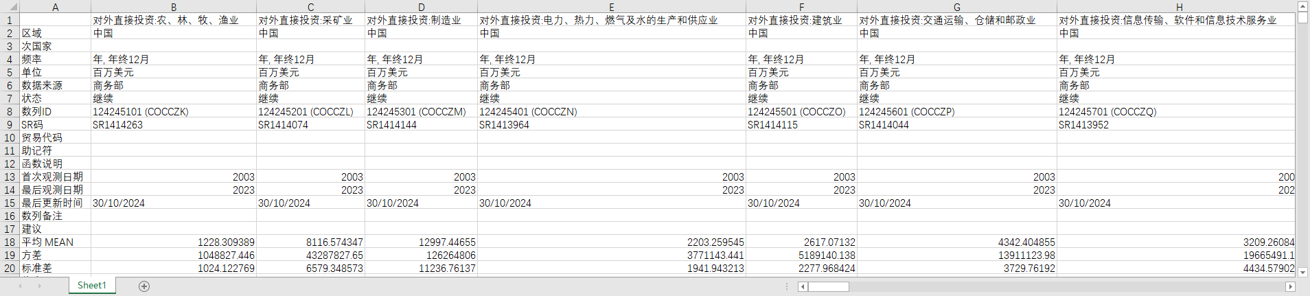 对外直接投资:农、林、牧、渔业 对外直接投资:采矿业 对外直接投资:制造业 对外直接投资:电力、热力、燃气及水的生产和供应业 对外直接投资:建筑业 对外直接投资:交通运输、仓储和邮政业 对外直接投资:信息传输、软件和信息技术服务业 对外直接投资:批发和零售业 对外直接投资:住宿和餐饮业 对外直接投资:金融业 对外直接投资:房地产业 对外直接投资:租赁和商务服务业 对外直接投资:科学研究和技术服务业 对外直接投资:水利、环境和公共设施管理业 对外直接投资:居民服务、修理和其他服务业 对外直接投资:教育 对外直接投资:卫生和社会工作 (DC)对外直接投资:卫生、社会保障和社会福利业 对外直接投资:文化、体育和娱乐业 对外直接投资:公共管理、社会保障和社会组织 (DC)对外直接投资:公共管理和社会组织 对外直接投资:截至累计:农、林、牧、渔业 对外直接投资:截至累计:采矿业 对外直接投资:截至累计:制造业 对外直接投资:截至累计:电力、热力、燃气及水的生产和供应业 对外直接投资:截至累计:建筑业 对外直接投资:截至累计:交通运输、仓储和邮政业 对外直接投资:截至累计:信息传输、软件和信息技术服务业 对外直接投资:截至累计:批发和零售业 对外直接投资:截至累计:住宿和餐饮业 对外直接投资:截至累计:金融业 对外直接投资:截至累计:房地产业 对外直接投资:截至累计:租赁和商务服务业 对外直接投资:截至累计:科学研究和技术服务业 对外直接投资:截至累计:水利、环境和公共设施管理业 对外直接投资:截至累计:居民服务、修理和其他服务业 对外直接投资:截至累计:教育 对外直接投资:截至累计:卫生和社会工作 (DC)对外直接投资:截至累计:卫生、社会保障和社会福利业 对外直接投资:截至累计:文化、体育和娱乐业 对外直接投资:截至累计:公共管理、社会保障和社会组织 (DC)对外直接投资:截至累计:公共管理和社会组织