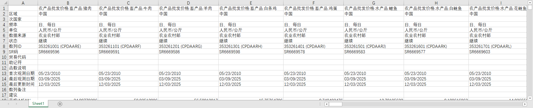 农产品批发价格:畜产品:猪肉 农产品批发价格:畜产品:牛肉 农产品批发价格:畜产品:羊肉 农产品批发价格:畜产品:白条鸡 农产品批发价格:畜产品:鸡蛋 农产品批发价格:水产品:鲤鱼 农产品批发价格:水产品:白鲢鱼 农产品批发价格:水产品:花鲢鱼 农产品批发价格:水产品:草鱼 农产品批发价格:水产品:鲫鱼 农产品批发价格:水产品:大带鱼 农产品批发价格:水产品:大黄花鱼 农产品批发价格:蔬菜 农产品批发价格:水果