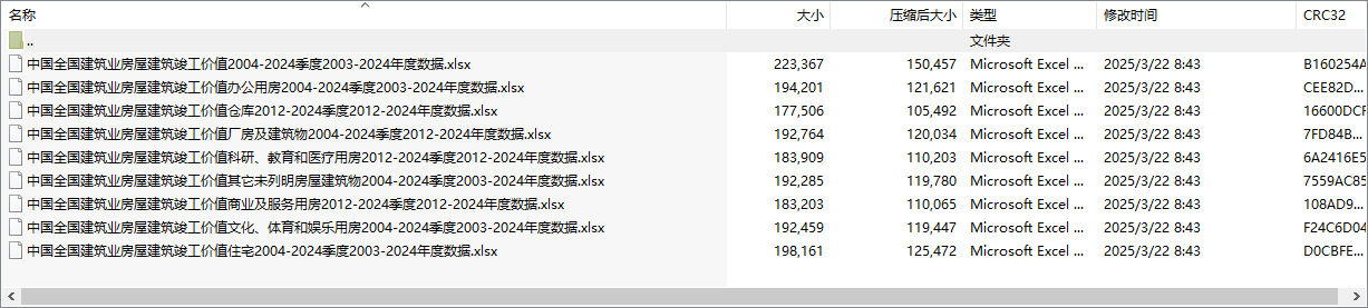 中国全国建筑业房屋建筑竣工价值住宅商业服务办公用房科研教育医疗文化体育娱乐仓库厂房及建筑物2004-2024季度分31个省份地区2003-2024年度数据