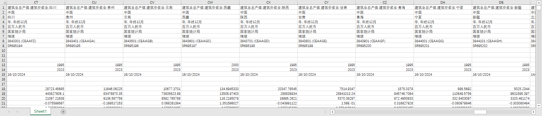 中国全国建筑业总产值行业分31个省份地区设备安装房屋建筑土木工程1995-2023年度建筑装饰业1995-2012