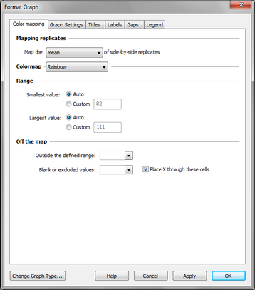 如果您输入了重复值(并排输入),之后您可以选择热图是基于平均值、中位数还是集合平均值来绘制。甚至可以选择创建一个关于变异的热图,并基于重复值的标准差(SD)、变异系数百分比(%CV)或标准误差均值(SEM)来绘制热图。