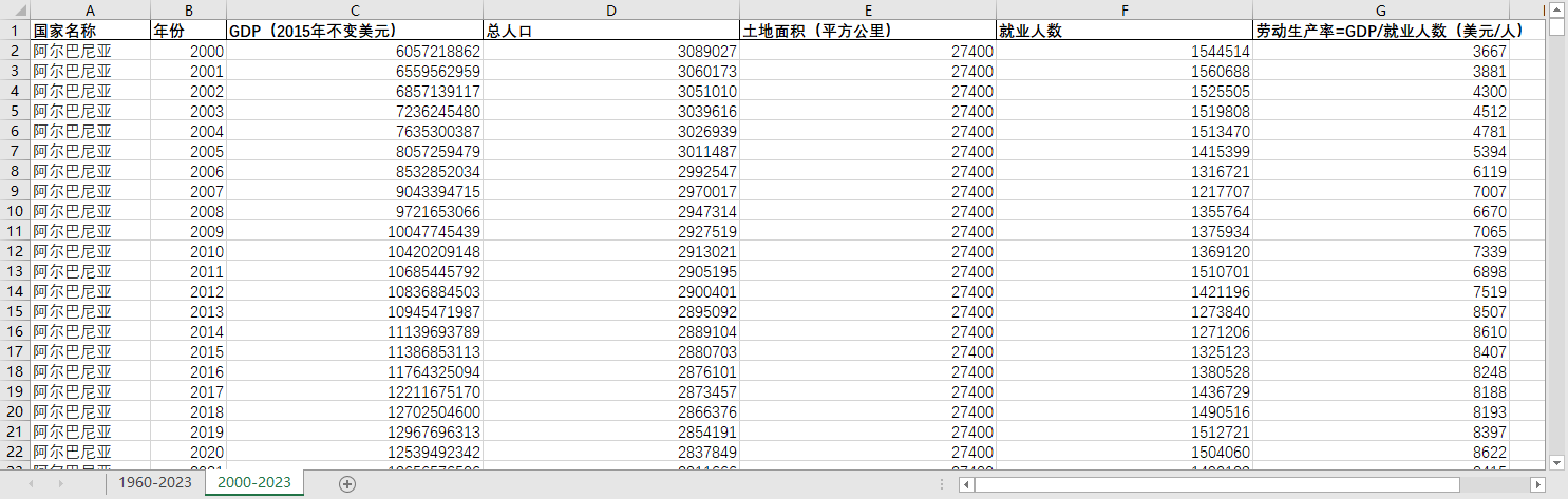 全球世界各国260多个国家和地区1960-2023 GDP、总人口、就业人数、劳动生产率数据国土.xlsx
