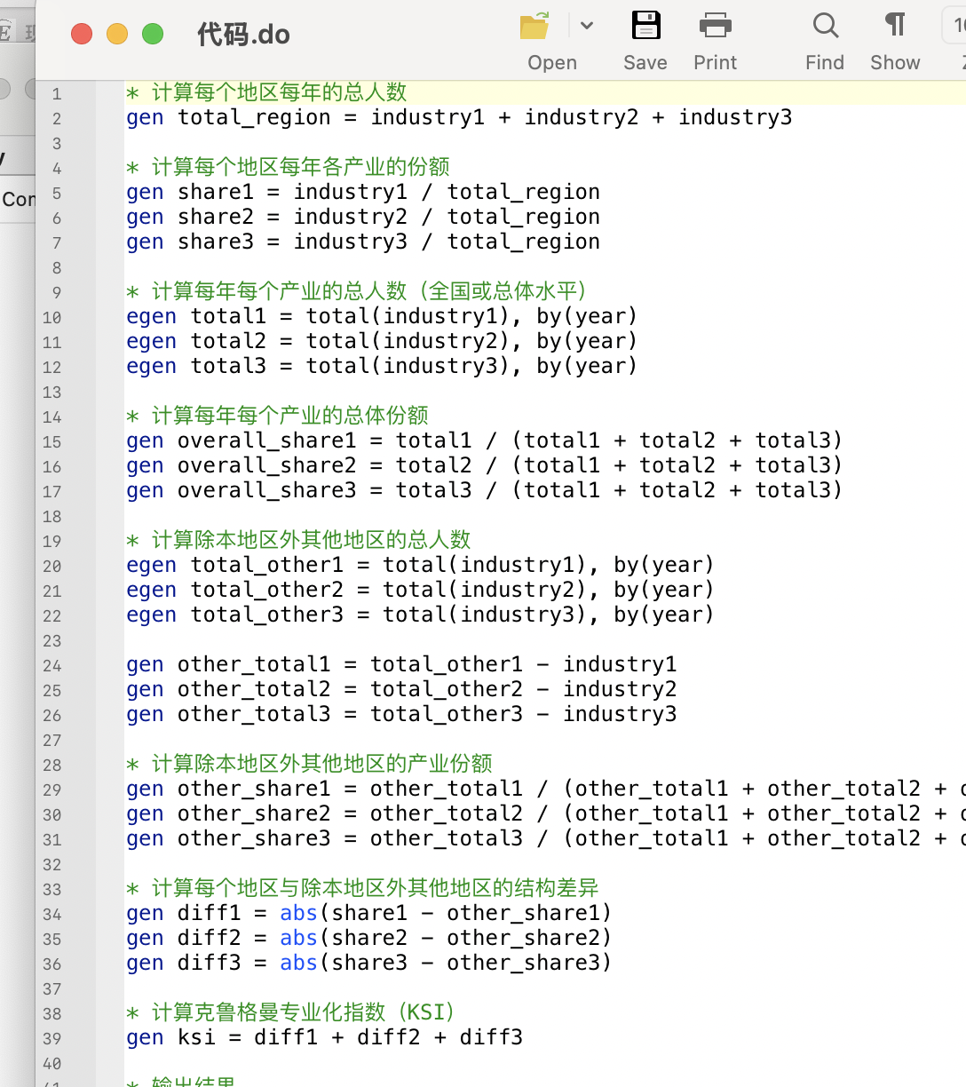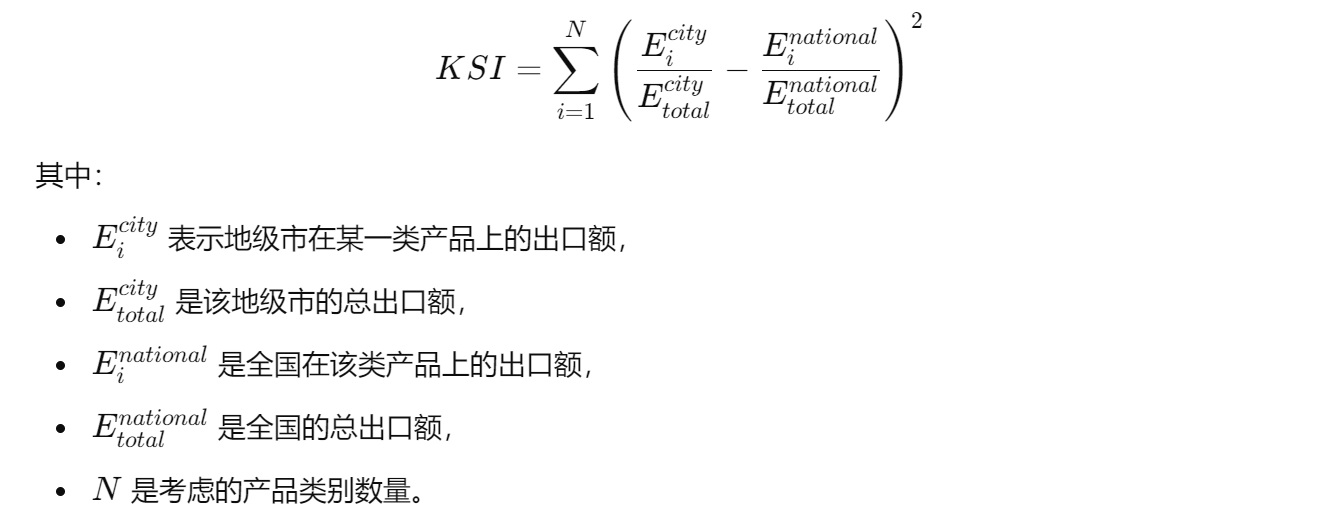 • 克鲁格曼专业化指数(KSI):反映该城市产业结构的专业化程度