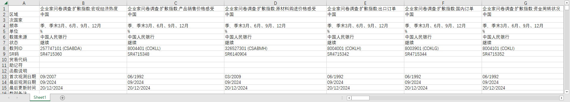 企业家问卷调查:扩散指数:宏观经济热度 企业家问卷调查:扩散指数:产品销售价格感受 企业家问卷调查:扩散指数:原材料购进价格感受 企业家问卷调查:扩散指数:出口订单 企业家问卷调查:扩散指数:国内订单 企业家问卷调查:扩散指数:资金周转状况 企业家问卷调查:扩散指数:销货款回笼状况 企业家问卷调查:扩散指数:经营景气 企业家问卷调查:扩散指数:企业盈利情况 企业家问卷调查:扩散指数:设备能力利用水平 企业家问卷调查:扩散指数:产成品库存水平 企业家问卷调查:扩散指数:银行贷款掌握状况 企业家问卷调查:扩散指数:固定资产投资情况 企业家问卷调查:扩散指数:企业家信心 (DC)企业家问卷调查:扩散指数:宏观经济热度预期 (DC)企业家问卷调查:扩散指数:企业经营预期 (DC)企业家问卷调查:扩散指数:能源供应状况 (DC)企业家问卷调查:扩散指数:原材料供应情况 (DC)企业家问卷调查:扩散指数:产品销售情况 (DC)企业家问卷调查:扩散指数:产品市场需求 (DC)企业家问卷调查:扩散指数:支付能力 (DC)企业家问卷调查:扩散指数:生产资料综合价格 (DC)企业家问卷调查:扩散指数:设备投资情况 (DC)企业家问卷调查:扩散指数:建筑 企业家问卷调查:宏观经济环境:"偏热"占比 企业家问卷调查:宏观经济环境:"正常"占比 企业家问卷调查:宏观经济环境:"偏冷"占比 企业家问卷调查:产品销售价格感受:"上升"占比 企业家问卷调查:产品销售价格感受:"持平"占比 企业家问卷调查:产品销售价格感受:"下降"占比 企业家问卷调查:原材料购进价格感受:"上升"占比 企业家问卷调查:原材料购进价格感受:"持平"占比 企业家问卷调查:原材料购进价格感受:"下降"占比 企业家问卷调查:出口订单数:"增加"占比 企业家问卷调查:出口订单数:"持平"占比 企业家问卷调查:出口订单数:"减少"占比 企业家问卷调查:国内订单数:"增加"占比 企业家问卷调查:国内订单数:"持平"占比 企业家问卷调查:国内订单数:"减少"占比 企业家问卷调查:资金周转状况:"良好"占比 企业家问卷调查:资金周转状况:"一般"占比 企业家问卷调查:资金周转状况:"困难"占比 企业家问卷调查:销货款回笼状况:"良好"占比 企业家问卷调查:销货款回笼状况:"一般"占比 企业家问卷调查:销货款回笼状况:"困难"占比 企业家问卷调查:企业经营状况:"较好"占比 企业家问卷调查:企业经营状况:"一般"占比 企业家问卷调查:企业经营状况:"较差"占比 企业家问卷调查:盈利状况:"增盈或减亏"占比 企业家问卷调查:盈利状况:"盈亏不变"占比 企业家问卷调查:盈利状况:"增亏或减盈"占比 企业家问卷调查:下季银行贷款预期:"偏严"占比 企业家问卷调查:下季银行贷款预期:"适度"占比 企业家问卷调查:下季银行贷款预期:"偏松"占比 企业家问卷调查:下季借款利率预期:"偏高"占比