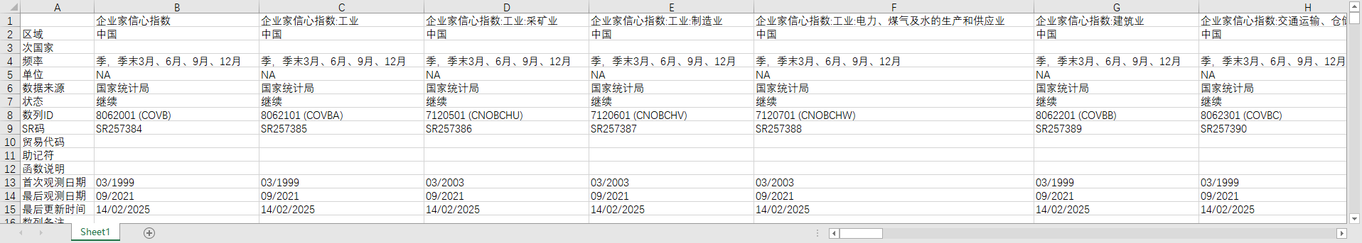企业家信心指数 企业家信心指数:工业 企业家信心指数:工业:采矿业 企业家信心指数:工业:制造业 企业家信心指数:工业:电力、煤气及水的生产和供应业 企业家信心指数:建筑业 企业家信心指数:交通运输、仓储及邮政业 企业家信心指数:信息传输、计算机服务和软件业 企业家信心指数:批发和零售业 企业家信心指数:住宿和餐饮业 企业家信心指数:房地产业 企业家信心指数:社会服务业 企业家信心指数:国有企业 企业家信心指数:私营企业 企业家信心指数:其他内资企业 企业家信心指数:联营企业 企业家信心指数:集体企业 企业家信心指数:股份合作企业 企业家信心指数:有限责任公司 企业家信心指数:股份有限公司 企业家信心指数:港澳台商投资企业 企业家信心指数:外商投资企业 (DC)企业家信心指数:外商及港澳台商投资企业 企业家信心指数:大型企业 企业家信心指数:中型企业 企业家信心指数:小型企业 企业家信心指数:东部地区 企业家信心指数:中部地区 企业家信心指数:西部地区