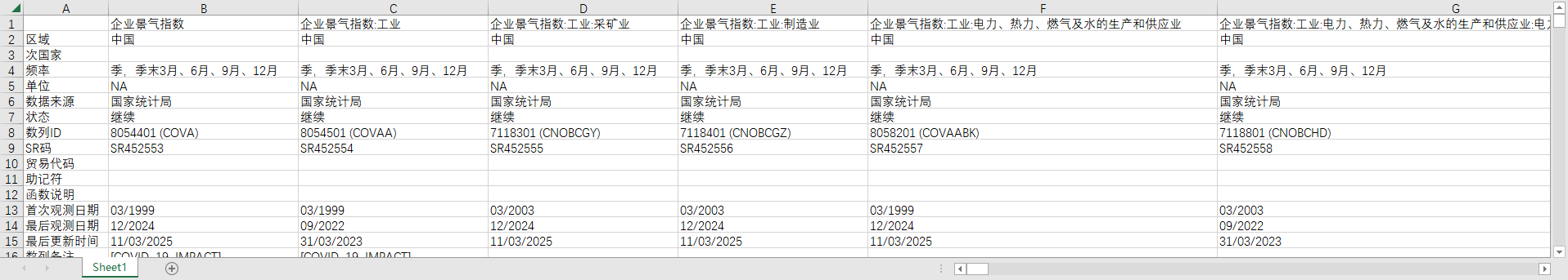 企业景气指数 企业景气指数:工业 企业景气指数:工业:采矿业 企业景气指数:工业:制造业 企业景气指数:工业:电力、热力、燃气及水的生产和供应业 企业景气指数:工业:电力、热力、燃气及水的生产和供应业:电力、热力生产和供应业 企业景气指数:工业:电力、热力、燃气及水的生产和供应业:燃气生产和供应业 企业景气指数:工业:电力、热力、燃气及水的生产和供应业:水的生产和供应业 企业景气指数:建筑业 企业景气指数:交通运输、仓储及邮政业 企业景气指数:信息传输、计算机服务和软件业 企业景气指数:批发和零售业 企业景气指数:住宿和餐饮业 企业景气指数:房地产业 企业景气指数:社会服务业 企业景气指数:国有企业 企业景气指数:私营企业 企业景气指数:其他内资企业 企业景气指数:联营企业 企业景气指数:集体企业 企业景气指数:股份合作企业 企业景气指数:有限责任公司 企业景气指数:股份有限公司 企业景气指数:港澳台商投资企业 企业景气指数:外商投资企业 (DC)企业景气指数:外商及港澳台商投资企业 企业景气指数:大型企业 企业景气指数:中型企业 企业景气指数:小型企业 企业景气指数:东部地区 企业景气指数:中部地区 企业景气指数:西部地区 企业景气指数:工业:采矿业:煤炭开采和洗选业 企业景气指数:工业:采矿业:石油和天然气开采业 企业景气指数:工业:采矿业:黑色金属矿采选业 企业景气指数:工业:采矿业:有色金属矿采选业 企业景气指数:工业:采矿业:非金属矿采选业 企业景气指数:工业:采矿业:开采辅助活动 企业景气指数:工业:采矿业:其他采矿业 企业景气指数:工业:制造业:农副食品加工业 企业景气指数:工业:制造业:食品制造业 企业景气指数:工业:制造业:酒、饮料和精制茶制造业 企业景气指数:工业:制造业:烟草制品业 企业景气指数:工业:制造业:纺织业 企业景气指数:工业:制造业:纺织服装、服饰业 企业景气指数:工业:制造业:皮革、毛皮、羽毛及其制品和制鞋业 (DC)企业景气指数:工业:制造业:纺织服装、鞋、帽制造业 (DC)企业景气指数:工业:制造业:皮革、毛皮、羽毛(绒)及其制品业 企业景气指数:工业:制造业:木材加工和木、竹、藤、棕、草制品业 企业景气指数:工业:制造业:家具制造业 企业景气指数:工业:制造业:造纸及纸制品业 企业景气指数:工业:制造业:印刷和记录媒介复制业 企业景气指数:工业:制造业:文教、工美、体育和娱乐用品制造业 (DC)企业景气指数:工业:制造业:文教体育用品制造业 企业景气指数:工业:制造业:石油加工、炼焦和核燃料加工业 企业景气指数:工业:制造业:化学原料和化学制品制造业 企业景气指数:工业:制造业:医药制造业 企业景气指数:工业:制造业:化学纤维制造业 企业景气指数:工业:制造业:橡胶和塑料制品业 (DC)企业景气指数:工业:制造业:橡胶制品业 (DC)企业景气指数:工业:制造业:塑料制品业 企业景气指数:工业:制造业:非金属矿物制品业 企业景气指数:工业:制造业:黑色金属冶炼和压延加工业 企业景气指数:工业:制造业:有色金属冶炼和压延加工业 企业景气指数:工业:制造业:金属制品业 企业景气指数:工业:制造业:通用设备制造业 企业景气指数:工业:制造业:专用设备制造业 企业景气指数:工业:制造业:汽车制造业 企业景气指数:工业:制造业:铁路、船舶、航空航天和其他运输设备制造业 (DC)企业景气指数:工业:制造业:交通运输设备制造业 企业景气指数:工业:制造业:电气机械和器材制造业 企业景气指数:工业:制造业:计算机、通信和其他电子设备制造业 企业景气指数:工业:制造业:仪器仪表制造业 (DC)企业景气指数:工业:制造业:仪器仪表及文化、办公用机械制造业 企业景气指数:工业:制造业:其他制造业 (DC)企业景气指数:工业:制造业:工艺品及其他制造业 企业景气指数:工业:制造业:废弃资源综合利用业 企业景气指数:工业:制造业:金属制品、机械和设备修理业 (DC)企业景气指数:建筑业:房屋和土木工程建筑业 (DC)企业景气指数:建筑业:建筑安装业 (DC)企业景气指数:建筑业:建筑装饰业 (DC)企业景气指数:建筑业:其他 (DC)企业景气指数:交通运输、仓储及邮政业:铁路运输业 (DC)企业景气指数:交通运输、仓储及邮政业:道路运输业 (DC)企业景气指数:交通运输、仓储及邮政业:城市公共交通业 (DC)企业景气指数:交通运输、仓储及邮政业:装卸搬运及其他运输服务业 (DC)企业景气指数:交通运输、仓储及邮政业:管道运输业 (DC)企业景气指数:交通运输、仓储及邮政业:水上运输业 (DC)企业景气指数:交通运输、仓储及邮政业:航空运输业 (DC)企业景气指数:交通运输、仓储及邮政业:仓储业 (DC)企业景气指数:交通运输、仓储及邮政业:邮政业 (DC)企业景气指数:信息传输、计算机服务和软件业:电信和其他信息传输服务业 (DC)企业景气指数:信息传输、计算机服务和软件业:计算机服务业 (DC)企业景气指数:信息传输、计算机服务和软件业:软件业 (DC)企业景气指数:批发和零售业:零售业 (DC)企业景气指数:批发和零售业:批发业 (DC)企业景气指数:住宿和餐饮业:住宿业 (DC)企业景气指数:住宿和餐饮业:餐饮业 (DC)企业景气指数:社会服务业:公共设施管理业 (DC)企业景气指数:社会服务业:居民服务业 (DC)企业景气指数:社会服务业:商务服务业 (DC)企业景气指数:社会服务业:环境管理业 (DC)企业景气