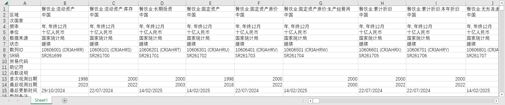 餐饮业:流动资产 餐饮业:流动资产:库存 餐饮业:长期投资 餐饮业:固定资产 餐饮业:固定资产原价 餐饮业:固定资产原价:生产经营用 餐饮业:累计折旧 餐饮业:累计折旧:本年折旧 餐饮业:无形及递延资产 餐饮业:无形资产 餐饮业:资产总计 餐饮业:流动负债 餐饮业:长期负债 餐饮业:负债合计 餐饮业:所有者权益合计 餐饮业:所有者权益合计:实收资本 餐饮业:所有者权益合计:实收资本:国有 餐饮业:所有者权益合计:实收资本:港澳台 餐饮业:所有者权益合计:实收资本:外商 餐饮业:营业收入 餐饮业:营业成本 餐饮业:营业费用 餐饮业:营业税金及附加 餐饮业:经营利润 餐饮业:管理费用 餐饮业:管理费用:税金 餐饮业:管理费用:财产保险 餐饮业:管理费用:待业保险 餐饮业:财务费用 餐饮业:财务费用:利息支出 餐饮业:营业利润 餐饮业:利润总额 餐饮业:应交所得税 餐饮业:应付利润 餐饮业:工资总额 餐饮业:工资总额:主营应付 餐饮业:福利费总额 餐饮业:福利费总额:主营应付 餐饮业:经营利润:内资企业 餐饮业:经营利润:内资企业:集体企业 餐饮业:经营利润:内资企业:股份合作企业 餐饮业:经营利润:内资企业:联营企业 餐饮业:经营利润:内资企业:有限责任公司 餐饮业:经营利润:内资企业:其它企业 餐饮业:经营利润:内资企业:私营企业 餐饮业:经营利润:内资企业:股份有限公司 餐饮业:经营利润:内资企业:国有企业 餐饮业:经营利润:外商投资企业 餐饮业:经营利润:外商投资企业:中外合作经营企业 餐饮业:经营利润:外商投资企业:中外合资经营企业 餐饮业:经营利润:外商投资企业:外商投资股份有限公司 餐饮业:经营利润:外商投资企业:外资企业 餐饮业:经营利润:港澳台商投资企业 餐饮业:经营利润:港澳台商投资企业:合作经营企业 餐饮业:经营利润:港澳台商投资企业:合资经营企业 餐饮业:经营利润:港澳台商投资企业:港澳台商投资股份有限公司 餐饮业:经营利润:港澳台商投资企业:港澳台商独资经营企业 餐饮业:经营利润:国有及国有控股 餐饮业:经营利润:正餐 餐饮业:经营利润:快餐 餐饮业:经营利润:其它餐饮业