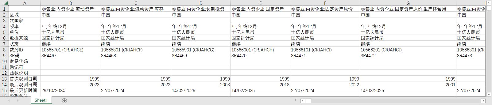 零售业:内资企业:流动资产 零售业:内资企业:流动资产:库存 零售业:内资企业:长期投资 零售业:内资企业:固定资产 零售业:内资企业:固定资产原价 零售业:内资企业:固定资产原价:生产经营用 零售业:内资企业:累计折旧 零售业:内资企业:累计折旧:本年折旧 零售业:内资企业:无形及递延资产 零售业:内资企业:无形资产 零售业:内资企业:资产总计 零售业:内资企业:流动负债 零售业:内资企业:长期负债 零售业:内资企业:负债合计 零售业:内资企业:所有者权益合计 零售业:内资企业:所有者权益合计:实收资本 零售业:内资企业:所有者权益合计:实收资本:国有 零售业:内资企业:所有者权益合计:实收资本:港澳台 零售业:内资企业:所有者权益合计:实收资本:外商 零售业:内资企业:营业收入 零售业:营业收入:内资企业:集体企业 零售业:营业收入:内资企业:股份合作企业 零售业:营业收入:内资企业:联营企业 零售业:营业收入:内资企业:有限责任公司 零售业:营业收入:内资企业:其它企业 零售业:营业收入:内资企业:私营企业 零售业:营业收入:内资企业:股份有限公司 零售业:营业收入:内资企业:国有企业 零售业:内资企业:营业收入净额 零售业:内资企业:营业成本 零售业:内资企业:经营费用 零售业:内资企业:经营费用:运杂费 零售业:内资企业:销售税金及附加 零售业:内资企业:商品销售利润 零售业:商品销售利润:内资企业:集体企业 零售业:商品销售利润:内资企业:股份合作企业 零售业:商品销售利润:内资企业:联营企业 零售业:商品销售利润:内资企业:有限责任公司 零售业:商品销售利润:内资企业:其它企业 零售业:商品销售利润:内资企业:私营企业 零售业:商品销售利润:内资企业:股份有限公司 零售业:商品销售利润:内资企业:国有企业 零售业:内资企业:代购代销收入 零售业:内资企业:主营业务利润 零售业:内资企业:其它业务利润 零售业:内资企业:管理费用 零售业:内资企业:管理费用:税金 零售业:内资企业:管理费用:财产保险 零售业:内资企业:管理费用:劳动待业险 零售业:内资企业:财务费用 零售业:内资企业:财务费用:利息支出 零售业:内资企业:营业利润 零售业:内资企业:补贴收入 零售业:内资企业:利润总额 零售业:内资企业:应交所得税 零售业:内资企业:应付利润 零售业:工资总额:内资企业