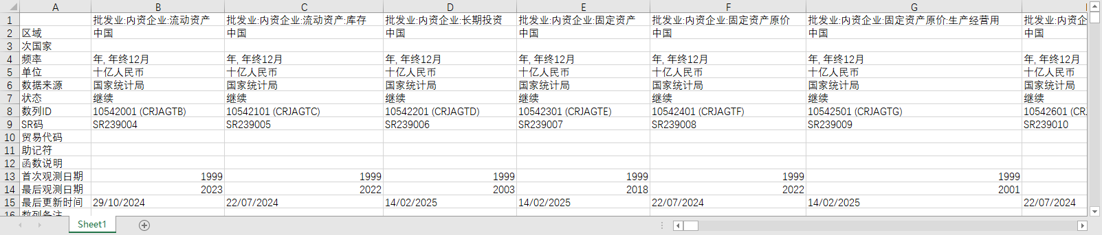 批发业:内资企业:流动资产 批发业:内资企业:流动资产:库存 批发业:内资企业:长期投资 批发业:内资企业:固定资产 批发业:内资企业:固定资产原价 批发业:内资企业:固定资产原价:生产经营用 批发业:内资企业:累计折旧 批发业:内资企业:累计折旧:本年折旧 批发业:内资企业:无形及递延资产 批发业:内资企业:无形资产 批发业:内资企业:资产总计 批发业:内资企业:流动负债 批发业:内资企业:长期负债 批发业:内资企业:负债合计 批发业:内资企业:所有者权益合计 批发业:内资企业:所有者权益合计:实收资本 批发业:内资企业:所有者权益合计:实收资本:国有 批发业:内资企业:所有者权益合计:实收资本:港澳台 批发业:内资企业:所有者权益合计:实收资本:外商 批发业:内资企业:营业收入 批发业:营业收入:内资企业:集体企业 批发业:营业收入:内资企业:股份合作企业 批发业:营业收入:内资企业:联营企业 批发业:营业收入:内资企业:有限责任公司 批发业:营业收入:内资企业:其它企业 批发业:营业收入:内资企业:私营企业 批发业:营业收入:内资企业:股份有限公司 批发业:营业收入:内资企业:国有企业 批发业:内资企业:营业收入净值 批发业:内资企业:营业成本 批发业:内资企业:经营费用 批发业:内资企业:经营费用:运杂费 批发业:内资企业:销售税金及附加 批发业:内资企业:商品销售利润 批发业:商品销售利润:内资企业:集体企业 批发业:商品销售利润:内资企业:股份合作企业 批发业:商品销售利润:内资企业:联营企业 批发业:商品销售利润:内资企业:有限责任公司 批发业:商品销售利润:内资企业:其它企业 批发业:商品销售利润:内资企业:私营企业 批发业:商品销售利润:内资企业:股份有限公司 批发业:商品销售利润:内资企业:国有企业 批发业:内资企业:代购代销收入 批发业:内资企业:主营业务利润 批发业:内资企业:其它业务利润 批发业:内资企业:管理费用 批发业:内资企业:管理费用:税金 批发业:内资企业:管理费用:财产保险 批发业:内资企业:管理费用:劳动待业险 批发业:内资企业:财务费用 批发业:内资企业:财务费用:利息支出 批发业:内资企业:营业利润 批发业:内资企业:补贴收入 批发业:内资企业:利润总额 批发业:内资企业:应交所得税 批发业:内资企业:应付利润 批发业:工资总额:内资企业