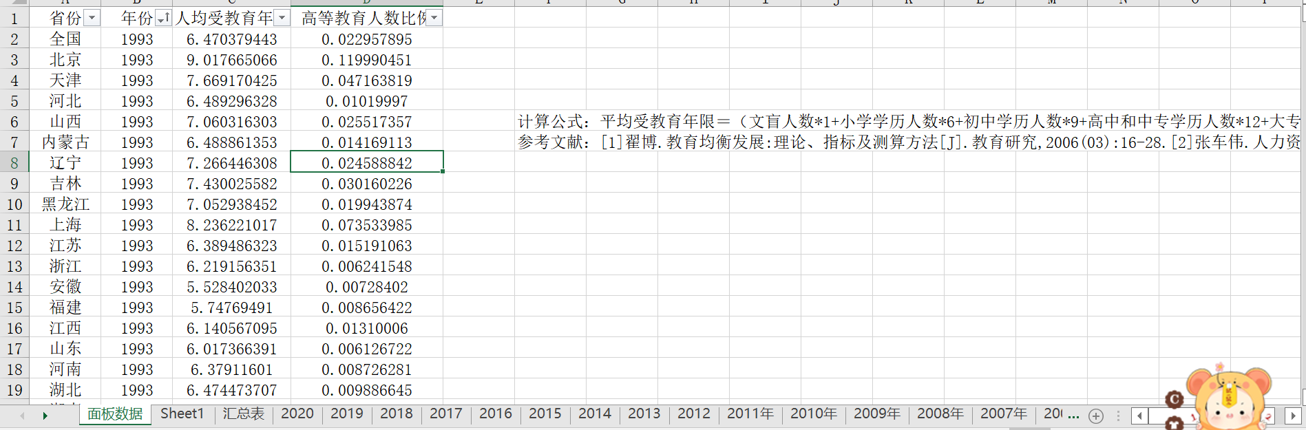 区分了的年份,平均受教育年限=(文盲人数+小学学历人数×6+初中学历人数×9+高中和中专学历人数×12+大专×15+本科×16+研究生×19)/6岁及以上人口总数