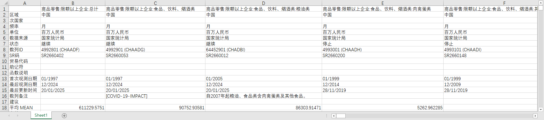 商品零售:限额以上企业:总计 商品零售:限额以上企业:食品、饮料、烟酒类 商品零售:限额以上企业:食品、饮料、烟酒类:粮油类 商品零售:限额以上企业:食品、饮料、烟酒类:肉禽蛋类 商品零售:限额以上企业:食品、饮料、烟酒类:其他食品 商品零售:限额以上企业:食品、饮料、烟酒类:饮料类 商品零售:限额以上企业:食品、饮料、烟酒类:烟酒类 商品零售:限额以上企业:服装鞋帽、针、纺织品类 商品零售:限额以上企业:服装鞋帽、针、纺织品类:服装类 商品零售:限额以上企业:服装鞋帽、针、纺织品类:鞋帽类 商品零售:限额以上企业:服装鞋帽、针、纺织品类:针、纺织品类 商品零售:限额以上企业:化妆品类 商品零售:限额以上企业:金银珠宝类 商品零售:限额以上企业:日用品类 商品零售:限额以上企业:日用品类:洗涤用品类 商品零售:限额以上企业:日用品类:儿童玩具类 商品零售:限额以上企业:五金、电料类 商品零售:限额以上企业:体育、娱乐用品类 商品零售:限额以上企业:书报杂志类 商品零售:限额以上企业:电子出版物及音像制品类 商品零售:限额以上企业:家用电器和音像器材类 商品零售:限额以上企业:中西药品类 商品零售:限额以上企业:中西药品类:西药类 商品零售:限额以上企业:中西药品类:中草药及中成药类 商品零售:限额以上企业:文化办公用品类 商品零售:限额以上企业:家具类 商品零售:限额以上企业:通讯器材类 商品零售:限额以上企业:煤炭及制品类 商品零售:限额以上企业:木材及制品类 商品零售:限额以上企业:石油及制品类 商品零售:限额以上企业:化工材料及制品类 商品零售:限额以上企业:化工材料及制品类:化肥类 商品零售:限额以上企业:金属材料类 商品零售:限额以上企业:建筑及装潢材料类 商品零售:限额以上企业:机电产品及设备类 商品零售:限额以上企业:机电产品及设备类:农机类 商品零售:限额以上企业:汽车类 商品零售:限额以上企业:种子饲料类 商品零售:限额以上企业:棉麻类 商品零售:限额以上企业:其他类 (DC)商品销售:限额以上企业 (DC)商品销售:限额以上企业:食品、饮料、烟酒类 (DC)商品销售:限额以上企业:食品、饮料、烟酒类:粮油类 (DC)商品销售:限额以上企业:食品、饮料、烟酒类:肉禽蛋类 (DC)商品销售:限额以上企业:食品、饮料、烟酒类:其他食品 (DC)商品销售:限额以上企业:食品、饮料、烟酒类:饮料类 (DC)商品销售:限额以上企业:食品、饮料、烟酒类:烟酒类 (DC)商品销售:限额以上企业:服装鞋帽、针、纺织品类 (DC)商品销售:限额以上企业:服装鞋帽、针、纺织品类:服装类 (DC)商品销售:限额以上企业:服装鞋帽、针、纺织品类:鞋帽类 (DC)商品销售:限额以上企业:服装鞋帽、针、纺织品类:针、纺织品类 (DC)商品销售:限额以上企业:化妆品类 (DC)商品销售:限额以上企业:金银珠宝类 (DC)商品销售:限额以上企业:日用品类 (DC)商品销售:限额以上企业:日用品类:洗涤用品类 (DC)商品销售:限额以上企业:日用品类:儿童玩具类 (DC)商品销售:限额以上企业:五金、电料类 (DC)商品销售:限额以上企业:体育、娱乐用品类 (DC)商品销售:限额以上企业:书报杂志类 (DC)商品销售:限额以上企业:电子出版物及音像制品类 (DC)商品销售:限额以上企业:家用电器和音像器材类 (DC)商品销售:限额以上企业:中西药品类 (DC)商品销售:限额以上企业:中西药品类:西药类 (DC)商品销售:限额以上企业:中西药品类:中草药及中成药类 (DC)商品销售:限额以上企业:文化办公用品类 (DC)商品销售:限额以上企业:家具类 (DC)商品销售:限额以上企业:通讯器材类 (DC)商品销售:限额以上企业:煤炭及制品类 (DC)商品销售:限额以上企业:木材及制品类 (DC)商品销售:限额以上企业:石油及制品类 (DC)商品销售:限额以上企业:化工材料及制品类 (DC)商品销售:限额以上企业:化工材料及制品类:化肥类 (DC)商品销售:限额以上企业:金属材料类 (DC)商品销售:限额以上企业:建筑及装潢材料类 (DC)商品销售:限额以上企业:机电产品及设备类 (DC)商品销售:限额以上企业:机电产品及设备类:农机类 (DC)商品销售:限额以上企业:汽车类 (DC)商品销售:限额以上企业:种子饲料类 (DC)商品销售:限额以上企业:棉麻类 (DC)商品销售:限额以上企业:其他类 (DC)商品销售:合计 (DC)商品销售:食品 (DC)商品销售:纺织品 (DC)商品销售:服装鞋帽 (DC)商品销售:日用品 (DC)商品销售:生活电器 (DC)商品销售:文化体育用品 (DC)商品销售:化妆品 (DC)商品销售:金银珠宝 (DC)商品销售:中西药品 (DC)商品销售:书报杂志 (DC)商品销售:石油及制品 (DC)商品销售:煤碳及制品 (DC)商品销售:化工材料 (DC)商品销售:木材 (DC)商品销售:建筑材料 (DC)商品销售:黑色金属材料 (DC)商品销售:有色金属材料 (DC)商品销售:机械、电子设备 (DC)商品销售:其他 (DC)商品销售:其他:生活消费品 (DC)商品批发:限额以上企业 (DC)商品批发:限额以上企业:食品、饮料、烟酒类 (DC)商品批发:限额以上企业:食品、饮料、烟酒类:粮油类 (DC)商品批发:限额以上企业:食品、饮料、烟酒类:肉禽蛋类 (DC)商品批发:限额以上企业:食品、饮料、烟酒类:其他食品 (DC)商品批发:限额以上企业:食品、饮料、烟酒类:饮料类 (DC)商品批发:限额以上企业:食品、饮料、烟酒类:烟酒类 (DC)商品批发:限额以上企业:服装鞋帽、针、纺织品类 (DC)商品批发:限额以上企业:服装鞋帽