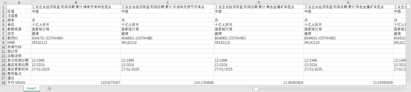 工业企业经济效益:利润总额:累计:煤炭开采和洗选业 工业企业经济效益:利润总额:累计:石油和天然气开采业 工业企业经济效益:利润总额:累计:黑色金属矿采选业 工业企业经济效益:利润总额:累计:有色金属矿采选业 工业企业经济效益:利润总额:累计:非金属矿采选业 工业企业经济效益:利润总额:累计:开采专业及辅助性活动 工业企业经济效益:利润总额:累计:其他采矿业 工业企业经济效益:利润总额:累计:农副食品加工业 工业企业经济效益:利润总额:累计:食品制造业 工业企业经济效益:利润总额:累计:酒、饮料和精制茶制造业 工业企业经济效益:利润总额:累计:烟草制品业 工业企业经济效益:利润总额:累计:纺织业 工业企业经济效益:利润总额:累计:纺织服装、服饰业 工业企业经济效益:利润总额:累计:皮革、毛皮、羽毛及其制品和制鞋业 (DC)工业企业经济效益:利润总额:累计:纺织服装、鞋、帽制造业 (DC)工业企业经济效益:利润总额:累计:皮革、毛皮、羽毛(绒)及其制品业 工业企业经济效益:利润总额:累计:木材加工和木、竹、藤、棕、草制品业 工业企业经济效益:利润总额:累计:家具制造业 工业企业经济效益:利润总额:累计:造纸和纸制品业 工业企业经济效益:利润总额:累计:印刷和记录媒介复制业 工业企业经济效益:利润总额:累计:文教、工美、体育和娱乐用品制造业 (DC)工业企业经济效益:利润总额:累计:文教体育用品制造业 工业企业经济效益:利润总额:累计:石油、煤炭及其他燃料加工业 工业企业经济效益:利润总额:累计:化学原料和化学制品制造业 工业企业经济效益:利润总额:累计:医药制造业 工业企业经济效益:利润总额:累计:化学纤维制造业 工业企业经济效益:利润总额:累计:橡胶和塑料制品业 (DC)工业企业经济效益:利润总额:累计:橡胶制品业 (DC)工业企业经济效益:利润总额:累计:塑料制品业 工业企业经济效益:利润总额:累计:非金属矿物制品业 工业企业经济效益:利润总额:累计:黑色金属冶炼和压延加工业 工业企业经济效益:利润总额:累计:有色金属冶炼和压延加工业 工业企业经济效益:利润总额:累计:金属制品业 工业企业经济效益:利润总额:累计:通用设备制造业 工业企业经济效益:利润总额:累计:专用设备制造业 工业企业经济效益:利润总额:累计:汽车制造业 工业企业经济效益:利润总额:累计:铁路、船舶、航空航天和其他运输设备制造业 (DC)工业企业经济效益:利润总额:累计:交通运输设备制造业 工业企业经济效益:利润总额:累计:电气机械和器材制造业 工业企业经济效益:利润总额:累计:计算机、通信和其他电子设备制造业 工业企业经济效益:利润总额:累计:仪器仪表制造业 (DC)工业企业经济效益:利润总额:累计:仪器仪表及文化、办公用机械制造业 工业企业经济效益:利润总额:累计:其他制造业 (DC)工业企业经济效益:利润总额:累计:工艺品及其他制造业 工业企业经济效益:利润总额:累计:废弃资源综合利用业 工业企业经济效益:利润总额:累计:金属制品、机械和设备修理业 工业企业经济效益:利润总额:累计:电力、热力生产和供应业 工业企业经济效益:利润总额:累计:燃气生产和供应业 工业企业经济效益:利润总额:累计:水的生产和供应业 (DC)工业企业经济效益:利润总额:累计:木材及竹材采运业 (DC)工业企业经济效益:利润总额:累计:食品加工业 工业企业经济效益:利润总额:累计同比:煤炭开采和洗选业 工业企业经济效益:利润总额:累计同比:石油和天然气开采业 工业企业经济效益:利润总额:累计同比:黑色金属矿采选业 工业企业经济效益:利润总额:累计同比:有色金属矿采选业 工业企业经济效益:利润总额:累计同比:非金属矿采选业 工业企业经济效益:利润总额:累计同比:开采专业及辅助性活动 工业企业经济效益:利润总额:累计同比:其他采矿业 工业企业经济效益:利润总额:累计同比:农副食品加工业 工业企业经济效益:利润总额:累计同比:食品制造业 工业企业经济效益:利润总额:累计同比:酒、饮料和精制茶制造业 工业企业经济效益:利润总额:累计同比:烟草制品业 工业企业经济效益:利润总额:累计同比:纺织业 工业企业经济效益:利润总额:累计同比:纺织服装、服饰业 工业企业经济效益:利润总额:累计同比:皮革、毛皮、羽毛及其制品和制鞋业 (DC)工业企业经济效益:利润总额:累计同比:纺织服装、鞋、帽制造业 (DC)工业企业经济效益:利润总额:累计同比:皮革、毛皮、羽毛(绒)及其制品业 工业企业经济效益:利润总额:累计同比:木材加工和木、竹、藤、棕、草制品业 工业企业经济效益:利润总额:累计同比:家具制造业 工业企业经济效益:利润总额:累计同比:造纸和纸制品业 工业企业经济效益:利润总额:累计同比:印刷和记录媒介复制业 工业企业经济效益:利润总额:累计同比:文教、工美、体育和娱乐用品制造业 (DC)工业企业经济效益:利润总额:累计同比:文教体育用品制造业 工业企业经济效益:利润总额:累计同比:石油、煤炭及其他燃料加工业 工业企业经济效益:利润总额:累计同比:化学原料和化学制品制造业 工业企业经济效益:利润总额:累计同比:医药制造业 工业企业经济效益:利润总额:累计同比:化学纤维制造业 工业企业经济效益:利润总额:累计同比:橡胶和塑料制品业 (DC)工业企业经济效益:利润总额:累计同比:橡胶制品业
