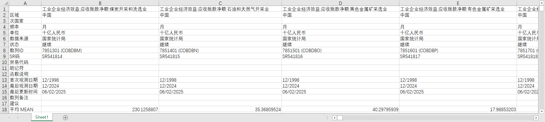 工业企业经济效益:应收账款净额:煤炭开采和洗选业 工业企业经济效益:应收账款净额:石油和天然气开采业 工业企业经济效益:应收账款净额:黑色金属矿采选业 工业企业经济效益:应收账款净额:有色金属矿采选业 工业企业经济效益:应收账款净额:非金属矿采选业 工业企业经济效益:应收账款净额:开采专业及辅助性活动 工业企业经济效益:应收账款净额:其他采矿业 工业企业经济效益:应收账款净额:农副食品加工业 工业企业经济效益:应收账款净额:食品制造业 工业企业经济效益:应收账款净额:酒、饮料和精制茶制造业 工业企业经济效益:应收账款净额:烟草制品业 工业企业经济效益:应收账款净额:纺织业 工业企业经济效益:应收账款净额:纺织服装、服饰业 工业企业经济效益:应收账款净额:皮革、毛皮、羽毛及其制品和制鞋业 (DC)工业企业经济效益:应收账款净额:纺织服装、鞋、帽制造业 (DC)工业企业经济效益:应收账款净额:皮革、毛皮、羽毛(绒)及其制品业 工业企业经济效益:应收账款净额:木材加工和木、竹、藤、棕、草制品业 工业企业经济效益:应收账款净额:家具制造业 工业企业经济效益:应收账款净额:造纸和纸制品业 工业企业经济效益:应收账款净额:印刷和记录媒介复制业 工业企业经济效益:应收账款净额:文教、工美、体育和娱乐用品制造业 (DC)工业企业经济效益:应收账款净额:文教体育用品制造业 工业企业经济效益:应收账款净额:石油、煤炭及其他燃料加工业 工业企业经济效益:应收账款净额:化学原料和化学制品制造业 工业企业经济效益:应收账款净额:医药制造业 工业企业经济效益:应收账款净额:化学纤维制造业 工业企业经济效益:应收账款净额:橡胶和塑料制品业 (DC)工业企业经济效益:应收账款净额:橡胶制品业 (DC)工业企业经济效益:应收账款净额:塑料制品业 工业企业经济效益:应收账款净额:非金属矿物制品业 工业企业经济效益:应收账款净额:黑色金属冶炼和压延加工业 工业企业经济效益:应收账款净额:有色金属冶炼和压延加工业 工业企业经济效益:应收账款净额:金属制品业 工业企业经济效益:应收账款净额:通用设备制造业 工业企业经济效益:应收账款净额:专用设备制造业 工业企业经济效益:应收账款净额:汽车制造业 工业企业经济效益:应收账款净额:铁路、船舶、航空航天和其他运输设备制造业 (DC)工业企业经济效益:应收账款净额:交通运输设备制造业 工业企业经济效益:应收账款净额:电气机械和器材制造业 工业企业经济效益:应收账款净额:计算机、通信和其他电子设备制造业 工业企业经济效益:应收账款净额:仪器仪表制造业 (DC)工业企业经济效益:应收账款净额:仪器仪表及文化、办公用机械制造业 工业企业经济效益:应收账款净额:其他制造业 (DC)工业企业经济效益:应收账款净额:工艺品及其他制造业 工业企业经济效益:应收账款净额:废弃资源综合利用业 工业企业经济效益:应收账款净额:金属制品、机械和设备修理业 工业企业经济效益:应收账款净额:电力、热力生产和供应业 工业企业经济效益:应收账款净额:燃气生产和供应业 工业企业经济效益:应收账款净额:水的生产和供应业 (DC)工业企业经济效益:应收账款净额:木材及竹材采运业 (DC)工业企业经济效益:应收账款净额:食品加工业 工业企业经济效益:应收账款净额:同比:煤炭开采和洗选业 工业企业经济效益:应收账款净额:同比:石油和天然气开采业 工业企业经济效益:应收账款净额:同比:黑色金属矿采选业 工业企业经济效益:应收账款净额:同比:有色金属矿采选业 工业企业经济效益:应收账款净额:同比:非金属矿采选业 工业企业经济效益:应收账款净额:同比:开采专业及辅助性活动 工业企业经济效益:应收账款净额:同比:其他采矿业 工业企业经济效益:应收账款净额:同比:农副食品加工业 工业企业经济效益:应收账款净额:同比:食品制造业 工业企业经济效益:应收账款净额:同比:酒、饮料和精制茶制造业 工业企业经济效益:应收账款净额:同比:烟草制品业 工业企业经济效益:应收账款净额:同比:纺织业 工业企业经济效益:应收账款净额:同比:纺织服装、服饰业 工业企业经济效益:应收账款净额:同比:皮革、毛皮、羽毛及其制品和制鞋业 (DC)工业企业经济效益:应收账款净额:同比:纺织服装、鞋、帽制造业 (DC)工业企业经济效益:应收账款净额:同比:皮革、毛皮、羽毛(绒)及其制品业 工业企业经济效益:应收账款净额:同比:木材加工和木、竹、藤、棕、草制品业 工业企业经济效益:应收账款净额:同比:家具制造业 工业企业经济效益:应收账款净额:同比:造纸和纸制品业 工业企业经济效益:应收账款净额:同比:印刷和记录媒介复制业 工业企业经济效益:应收账款净额:同比:文教、工美、体育和娱乐用品制造业 (DC)工业企业经济效益:应收账款净额:同比:文教体育用品制造业 工业企业经济效益:应收账款净额:同比:石油、煤炭及其他燃料加工业 工业企业经济效益:应收账款净额:同比:化学原料和化学制品制造业 工业企业经济效益:应收账款净额:同比:医药制造业 工业企业经济效益:应收账款净额:同比:化学纤维制造业 工业企业经济效益:应收账款净额:同比:橡胶和塑料制品业 (DC)工业企业经济效益:应收账款净额:同比:橡胶制品业 (DC)工业企业经济效益:应收账款净额: