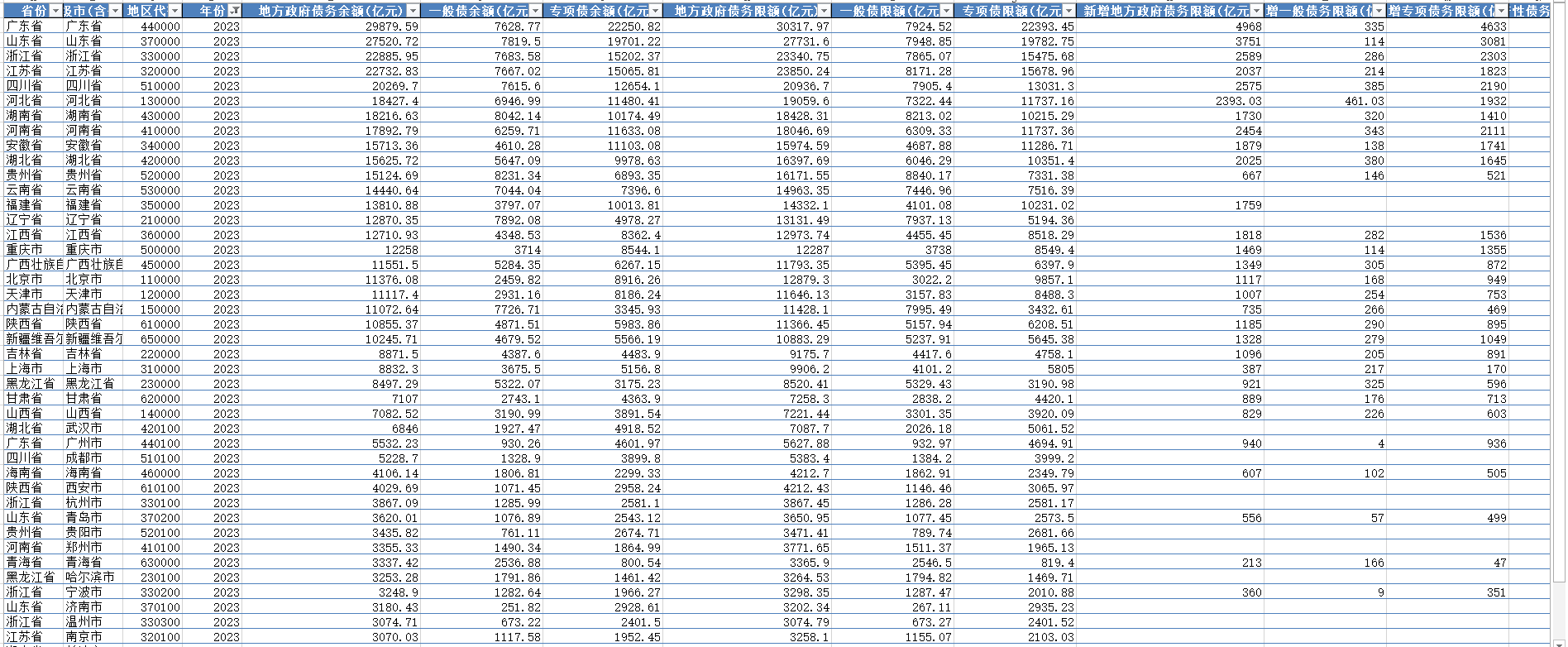 2014-2023年全国31省及全国333个地级行政区地方政府债务数据