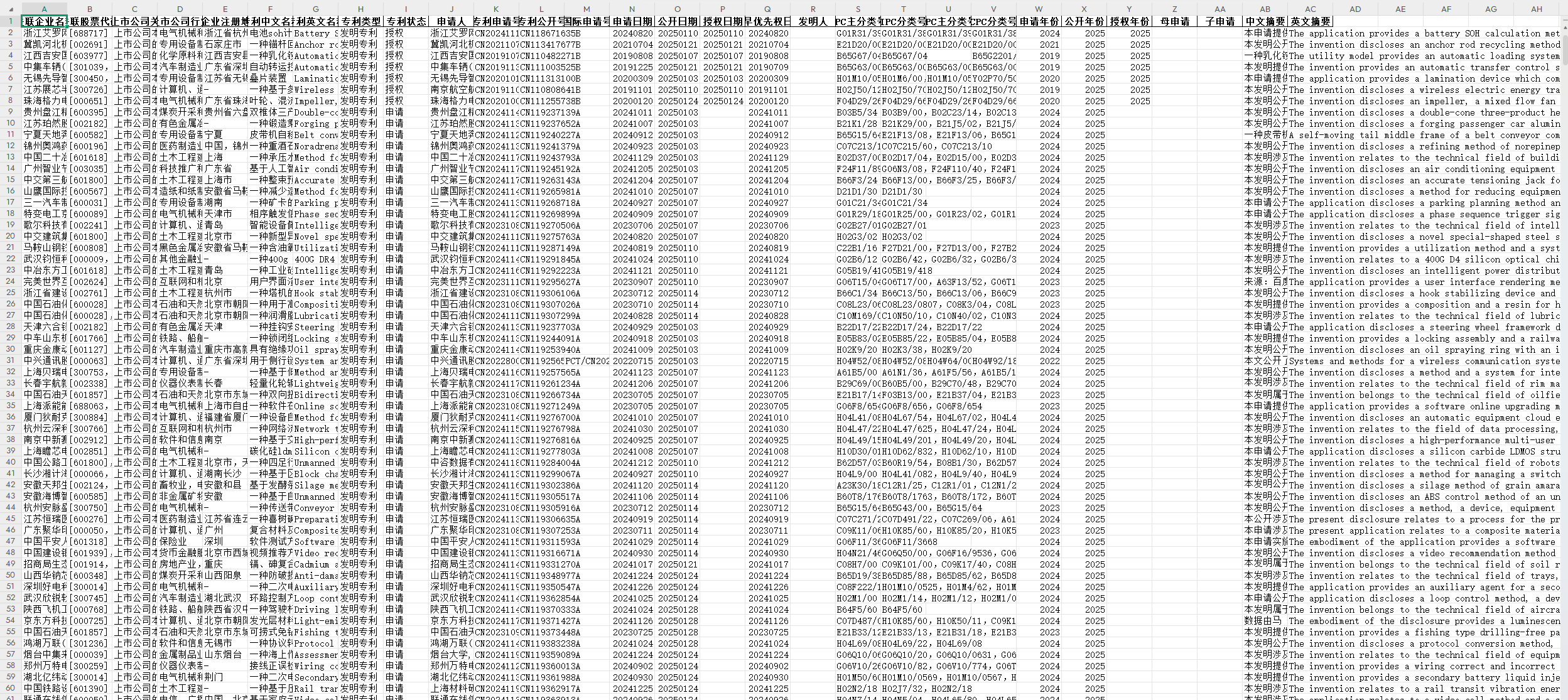 对上市公司专利数据进行了更新,不仅收录了上市公司本身,也包括子公司、联营、合营公司的历年专利数据。包含关联股票代码、与上市公司关系、行业、专利名称、专利类型、专利状态、IPC分类号、CPC分类号、摘要、母申请、子申请等26项指标