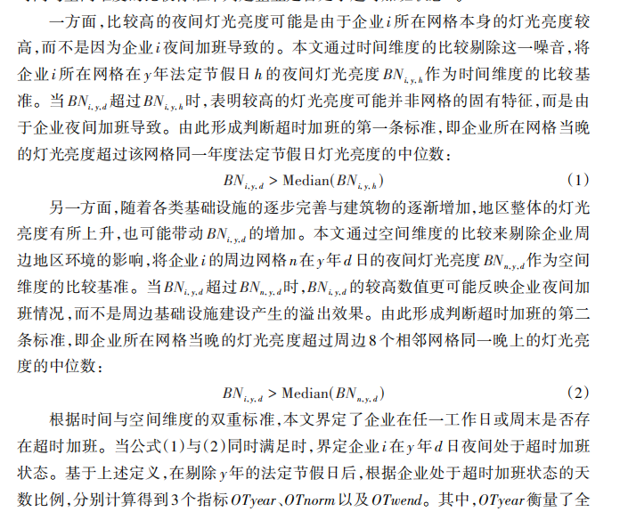 夜间灯光亮度是指通过卫星传感器探测到的地球表面在夜间的灯光亮度。上市公司周边夜间灯光亮度,则特指上市公司所在地理位置及其周边区域的夜间灯光亮度情况。有研究利用夜间灯光数据来估算上市公司的加班情况。通过比较公司所在网格的夜间灯光亮度与特定基准值(如法定节假日的灯光亮度中位数、周边网格的灯光亮度中位数),来判断公司是否存在超时加班。