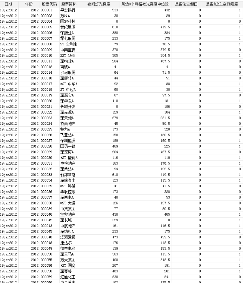 日期 年份 股票代码 股票简称 夜间灯光亮度 周边8个网格夜光亮度中位数 是否法定假日 是否加班_空间维度 法定节假日的年夜光亮度中位数 是否加班_时间维度 同时满足时间和空间维度标准 年加班天数 办公地址_经度 办公地址_纬度