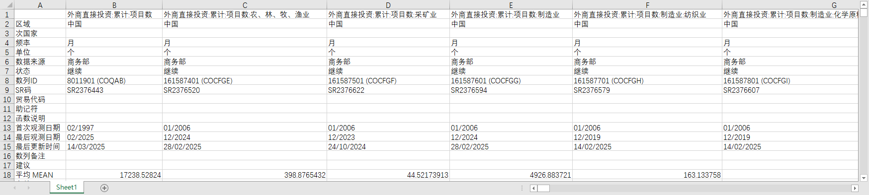 中国全国外商直接投资FDI项目数细分行业2006-2024月度数据农林牧渔采矿制造建筑业交通运输仓储物流房地产金融等