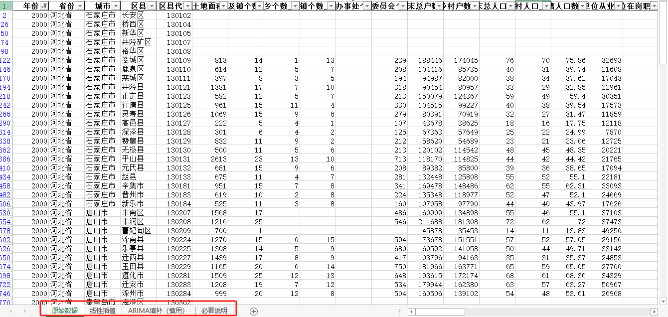 中国区县面板统计数据库(包含三个页签:原始数据、线性插值、ARIMA填补三个页签),收录了全国2700多个县域单位的基本情况、综合经济、农业、工业、教育、卫生、社会保障等方面的资料。