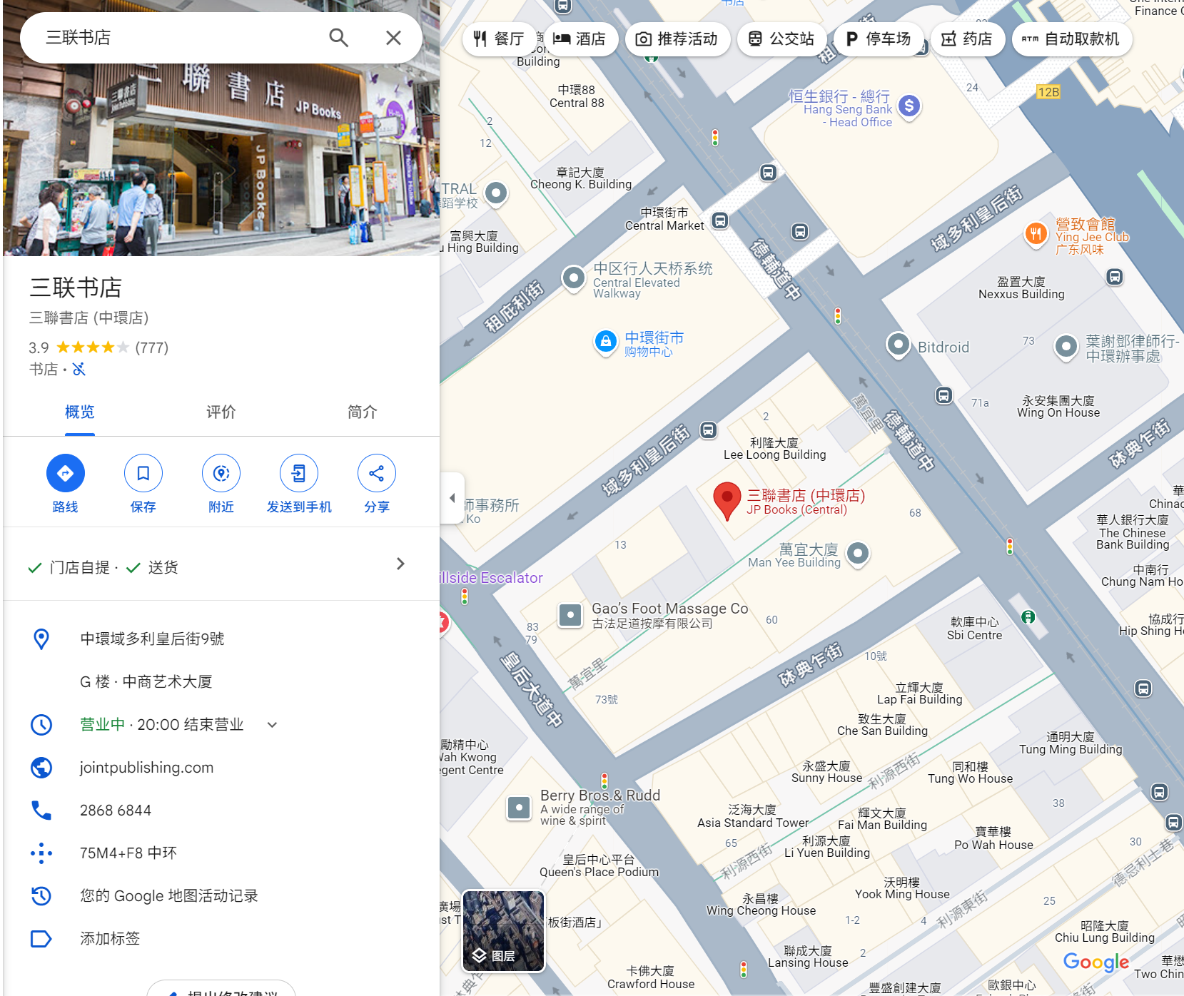 书店地址是香港灣仔柯布連道1-1A號(港鐵灣仔站A3出口),地图搜索“三联书店(中环店)”