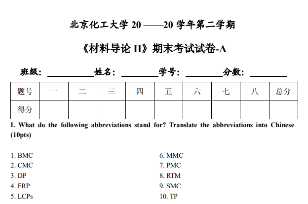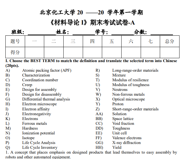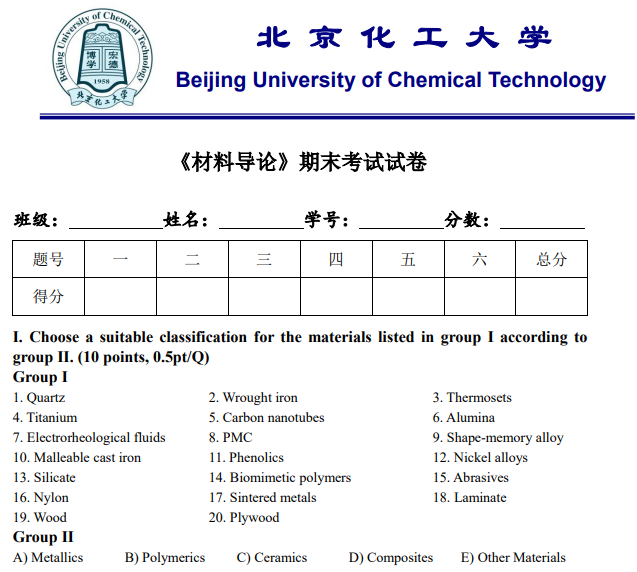 01北化北京化工大学材料导论期末试卷及答案一套(即一年的).pdf