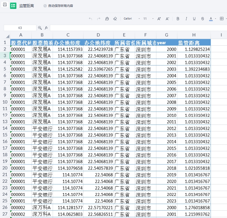 计算方法:监管距离的计算基于公司办公地与当地证监局所在位置的经纬度数据,通过计算两地之间的地理距离,然后取其自然对数,作为监管距离的衡量指标