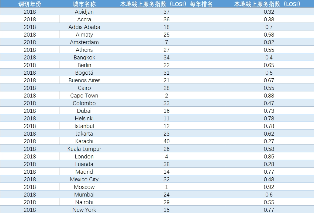 调研年份 | 城市名称 | 本地线上服务指数(LOSI)每年排名 | 本地线上服务指数(LOSI) |