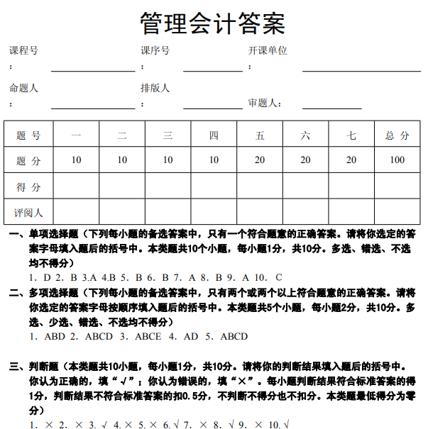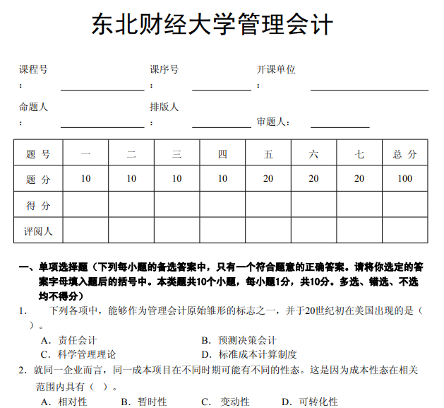01东财东北财经大学管理会计及答案一套(即一年的)