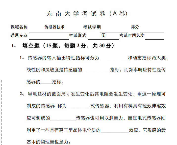 01东大东南大学传感器技术期末试卷(无答案)一套(即一年的)