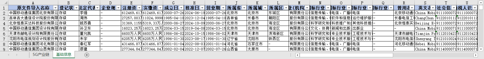 5G产业链全国上中下游企业信息1949-2024节点关联性参保人数联系电话法定代表人所属行业省份城市区县等