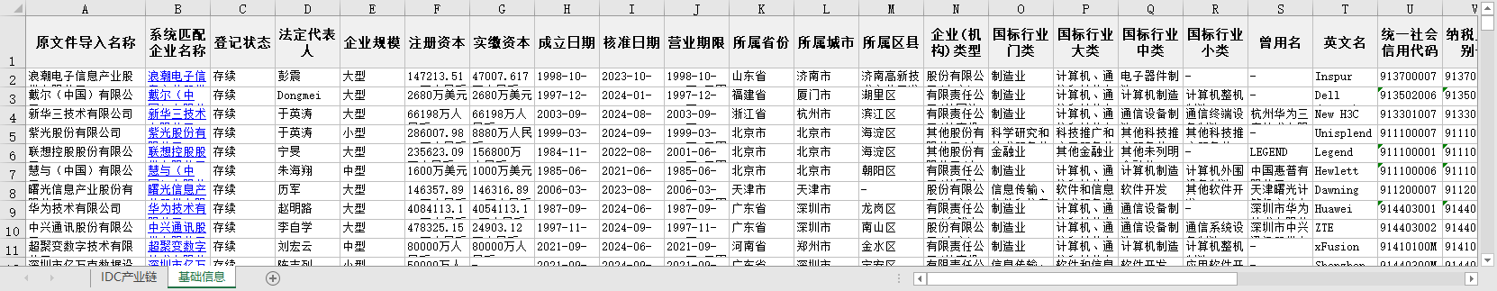 IDCIT计算机产业链全国上中下游企业信息1949-2024节点关联性参保人数联系电话法定代表人所属行业省份城市区县等
