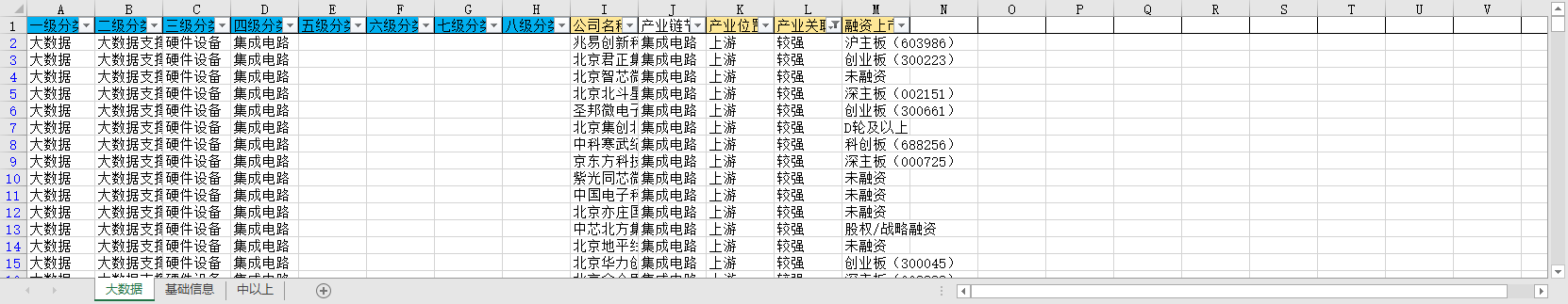 一级分类 二级分类 三级分类 四级分类 五级分类 六级分类 七级分类 八级分类 公司名称 ID 产业链节点 产业位置 产业关联性 融资上市