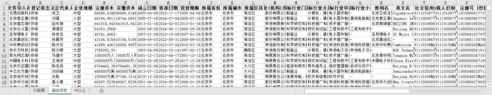 原文件导入名称 登记状态 法定代表人 企业规模 注册资本 实缴资本 成立日期 核准日期 营业期限 所属省份 所属城市 所属区县 企业(机构)类型 国标行业门类 国标行业大类 国标行业中类 国标行业小类 曾用名 英文名 统一社会信用代码 纳税人识别号 注册号 组织机构代码 参保人数 参保人数所属年报 电话 更多电话 企业地址 通信地址 官网 邮箱 更多邮箱 经营范围 登记机关 纳税人资质 企业简介 最新年报年份 等等