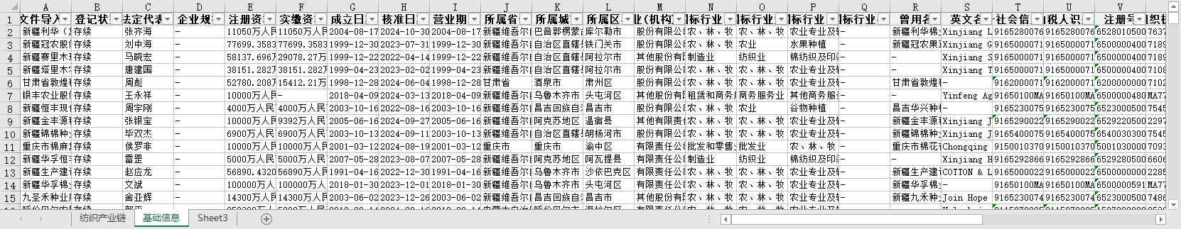 原文件导入名称 登记状态 法定代表人 企业规模 注册资本 实缴资本 成立日期 核准日期 营业期限 所属省份 所属城市 所属区县 企业(机构)类型 国标行业门类 国标行业大类 国标行业中类 国标行业小类 曾用名 英文名 统一社会信用代码 纳税人识别号 注册号 组织机构代码 参保人数 参保人数所属年报 电话 更多电话 企业地址 通信地址 官网 邮箱 更多邮箱 经营范围 登记机关 纳税人资质 企业简介 最新年报年份 等等