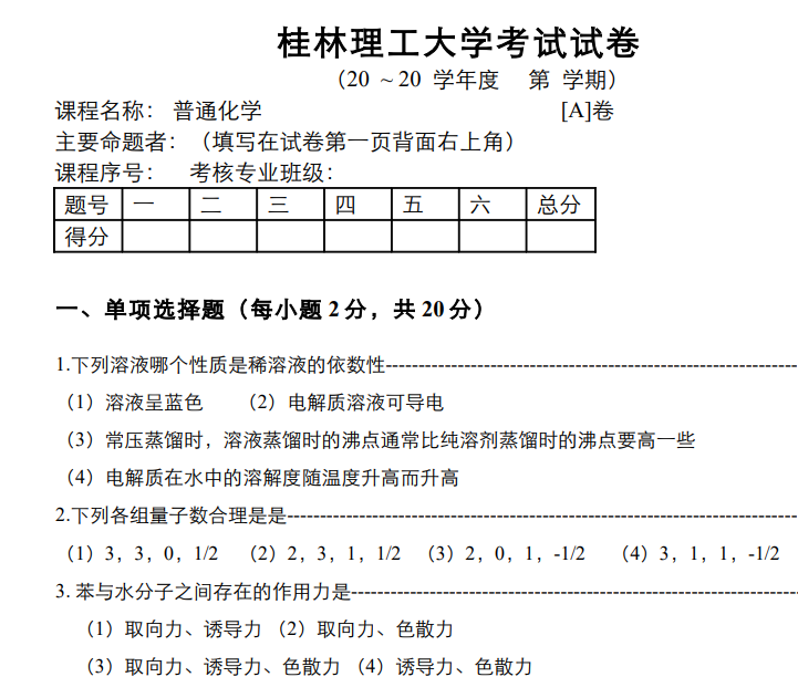 04桂工桂林理工大学普通化学无答案一套(即一年的)