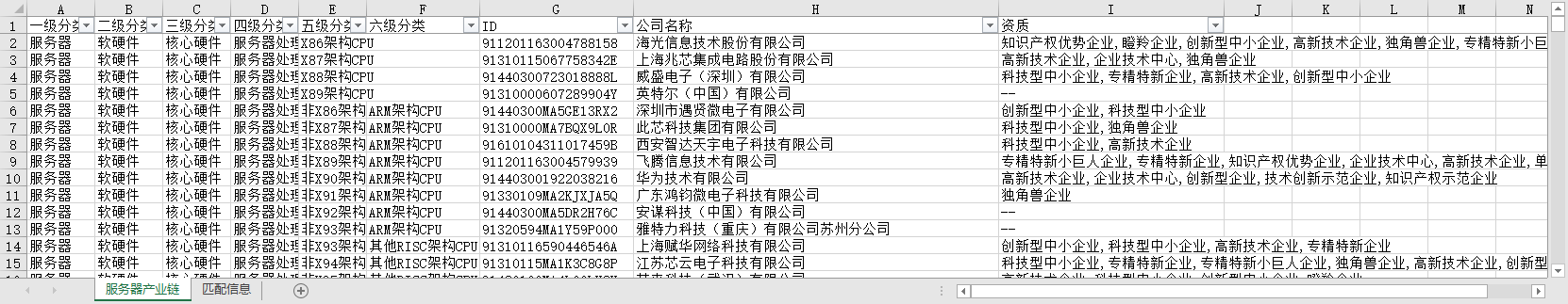 另外还有一个高新技术企业、科技型中小企业、创新型中小企业、独角兽瞪羚雏鹰隐形冠军专精特新小巨人、等荣誉、企业资质的匹配信息excel数据文件