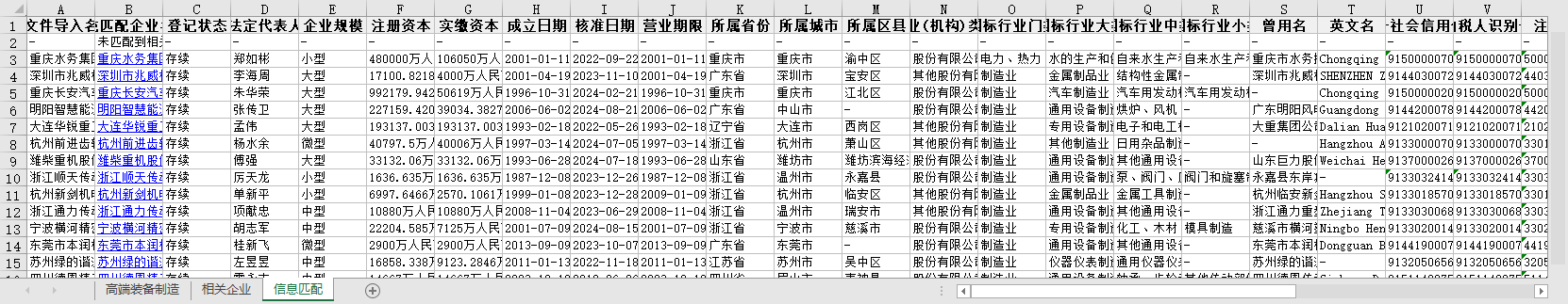 原文件导入名称 登记状态 法定代表人 企业规模 注册资本 实缴资本 成立日期 核准日期 营业期限 所属省份 所属城市 所属区县 企业(机构)类型 国标行业门类 国标行业大类 国标行业中类 国标行业小类 曾用名 英文名 统一社会信用代码 纳税人识别号 注册号 组织机构代码 参保人数 参保人数所属年报 电话 更多电话 企业地址 通信地址 官网 邮箱 更多邮箱 经营范围 登记机关 纳税人资质 企业简介 最新年报年份 等等