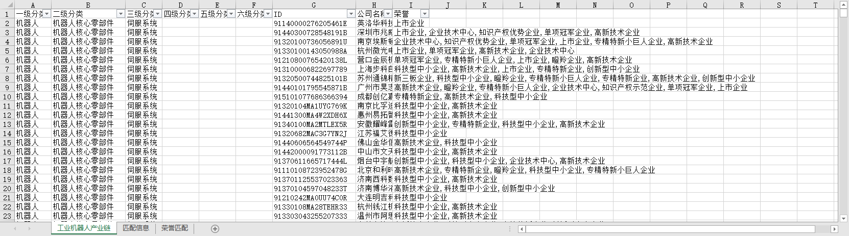 另外还有一个高新技术企业、科技型中小企业、创新型中小企业、独角兽瞪羚雏鹰隐形冠军专精特新小巨人等荣誉、企业资质的匹配信息excel数据文件