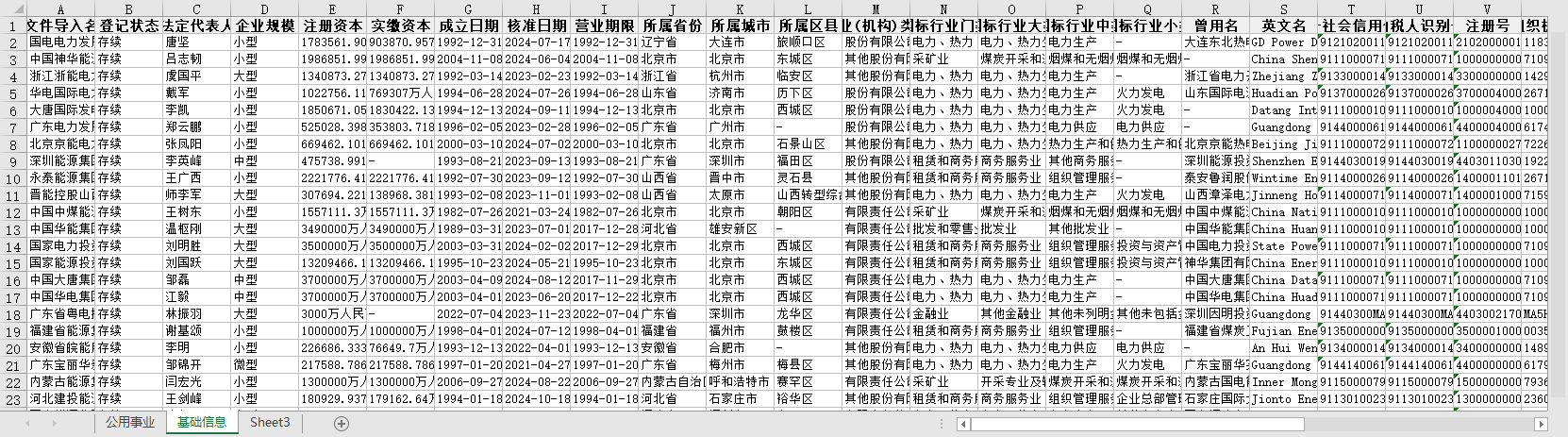 原文件导入名称 登记状态 法定代表人 企业规模 注册资本 实缴资本 成立日期 核准日期 营业期限 所属省份 所属城市 所属区县 企业(机构)类型 国标行业门类 国标行业大类 国标行业中类 国标行业小类 曾用名 英文名 统一社会信用代码 纳税人识别号 注册号 组织机构代码 参保人数 参保人数所属年报 电话 更多电话 企业地址 通信地址 官网 邮箱 更多邮箱 经营范围 登记机关 纳税人资质 企业简介 最新年报年份 等等
