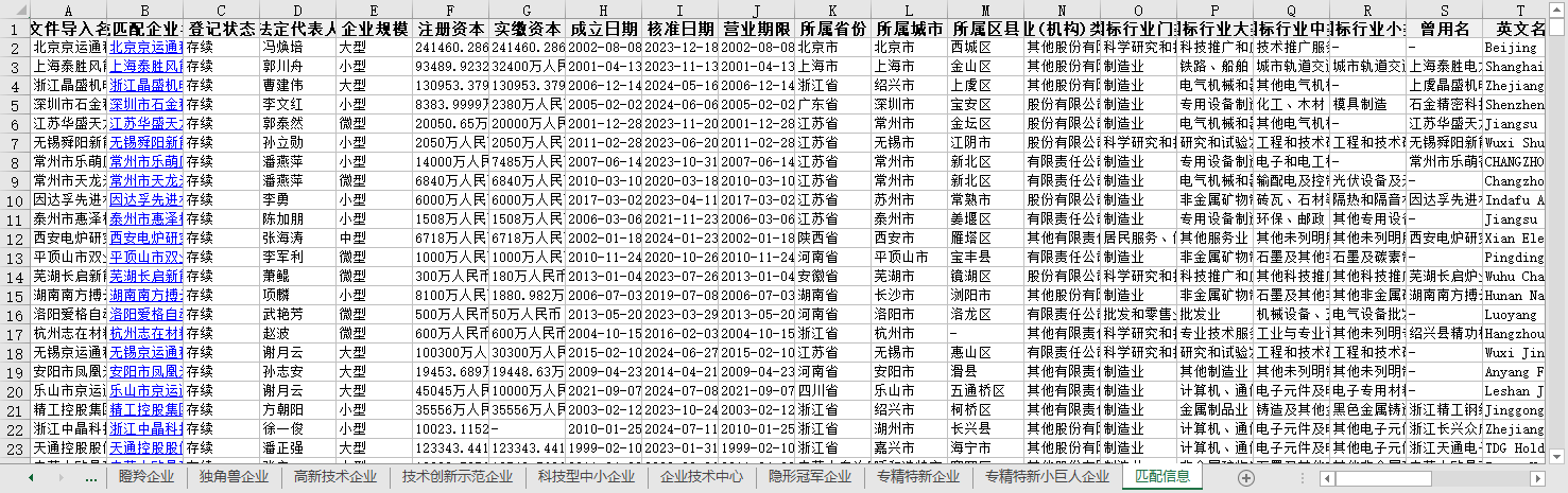 另外还有一个高新技术企业、科技型中小企业、创新型中小企业、独角兽瞪羚雏鹰隐形冠军专精特新小巨人等荣誉、企业资质的匹配信息excel数据文件