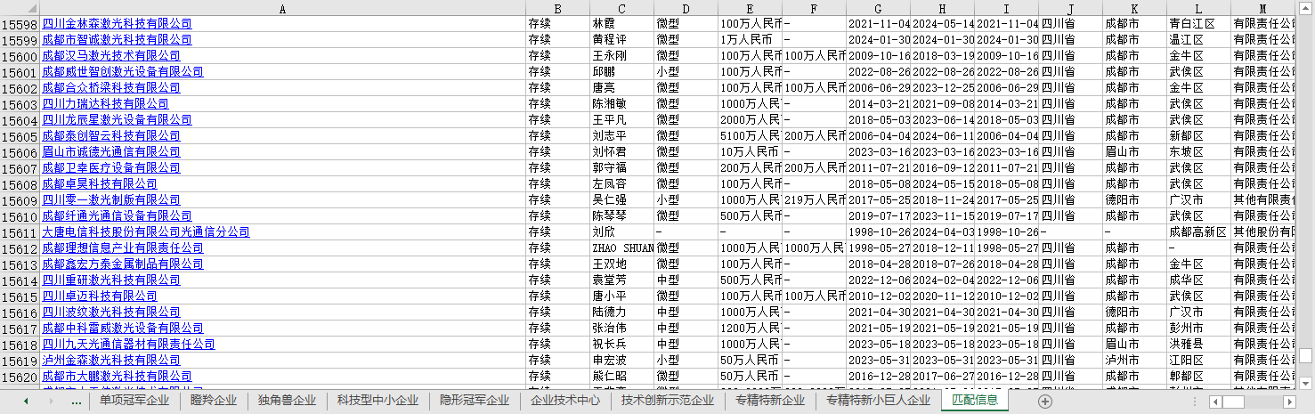 另外还有一个高新技术企业、科技型中小企业、创新型中小企业、独角兽瞪羚雏鹰隐形冠军专精特新小巨人等荣誉、企业资质的匹配信息excel数据文件